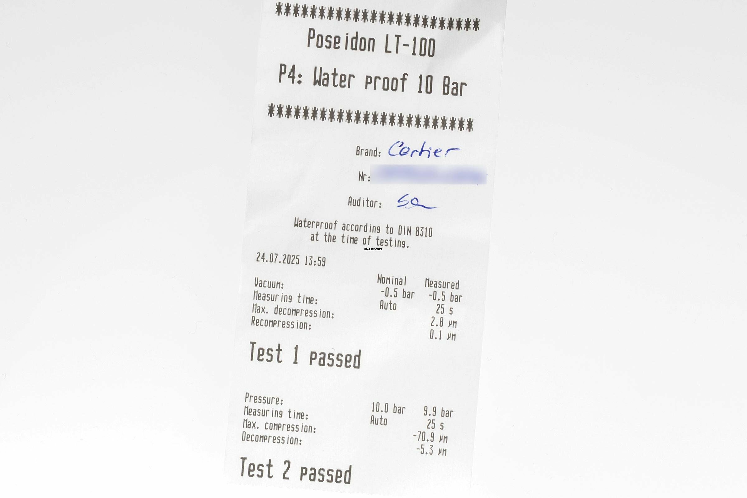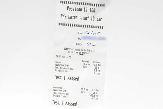 * Wenn die Uhr positiv auf Wasserdichtigkeit getestet wurde, dann gilt diese Eigenschaft zum Zeitpunkt der Messung. Wasserdichtigkeit ist nach DIN 8310 keine bleibende Eigenschaft. Sie sollte jährlich und vor besonderen Belastungen überprüft werden, da die eingebauten Dichtelemente in ihrer Funktion und im täglichen Gebrauch nachlassen. Einflüsse wie starke Temperaturschwankungen, Chlor, Seife oder Salzwasser wirken sich negativ auf die Wasserdichtigkeit aus.