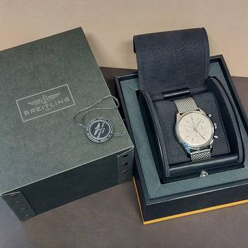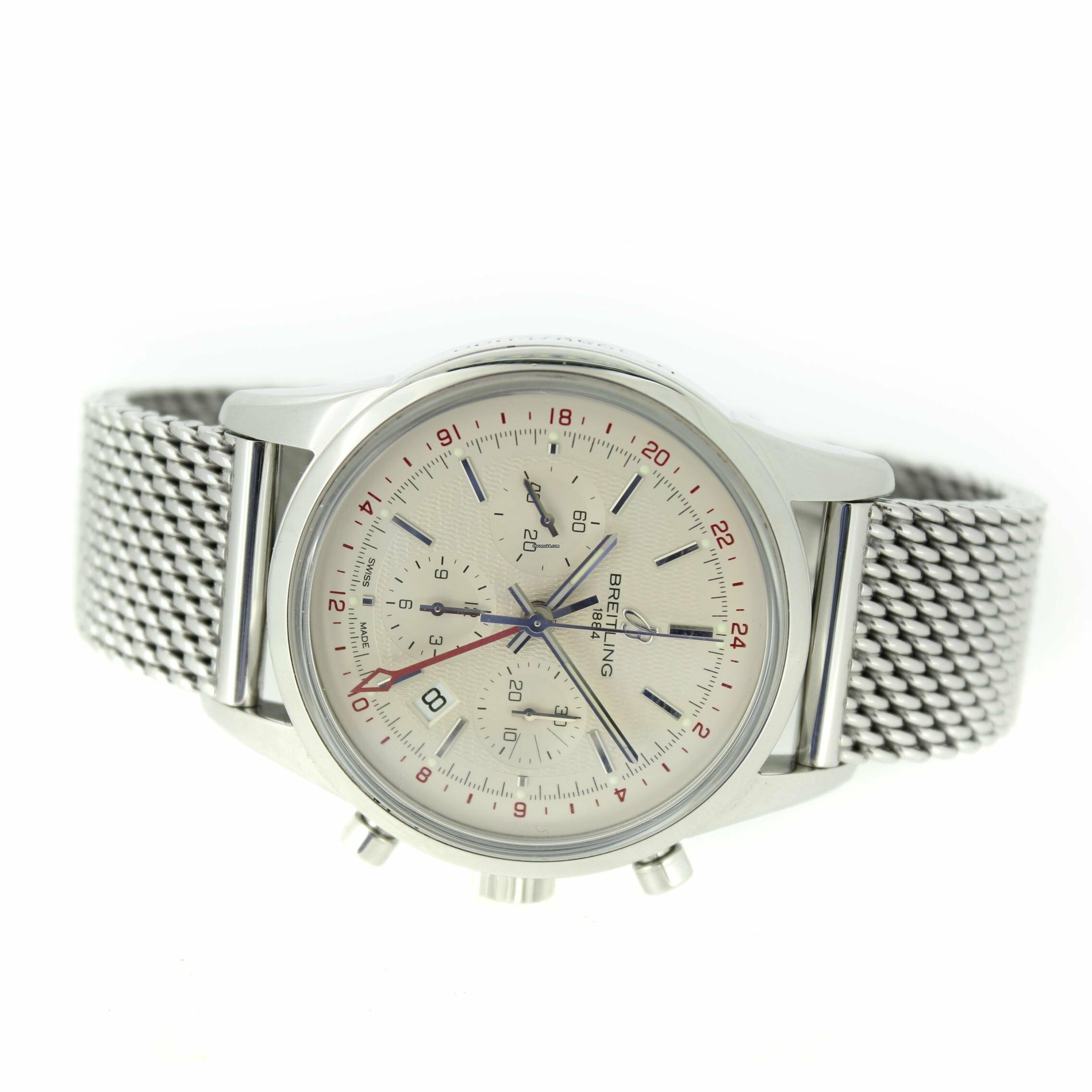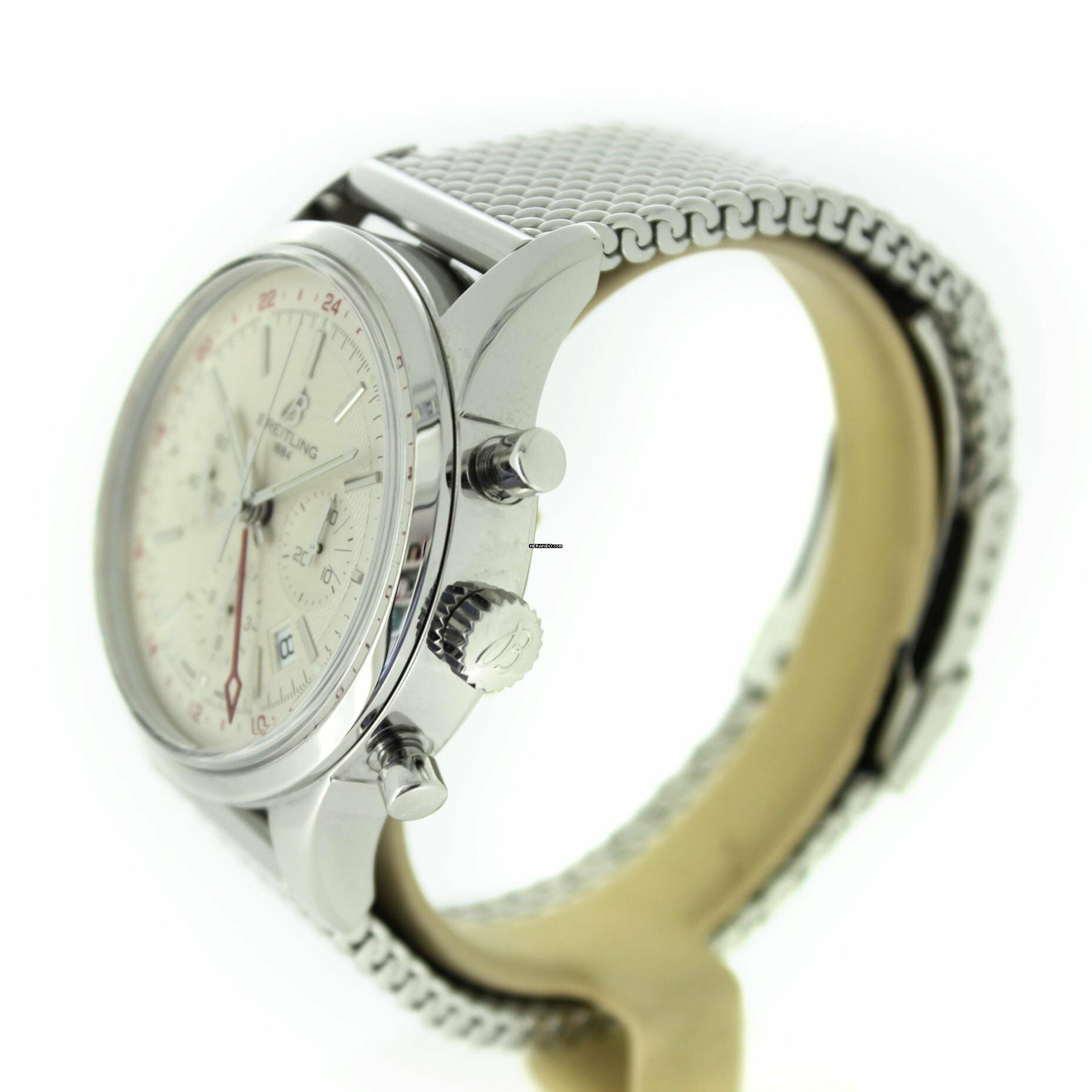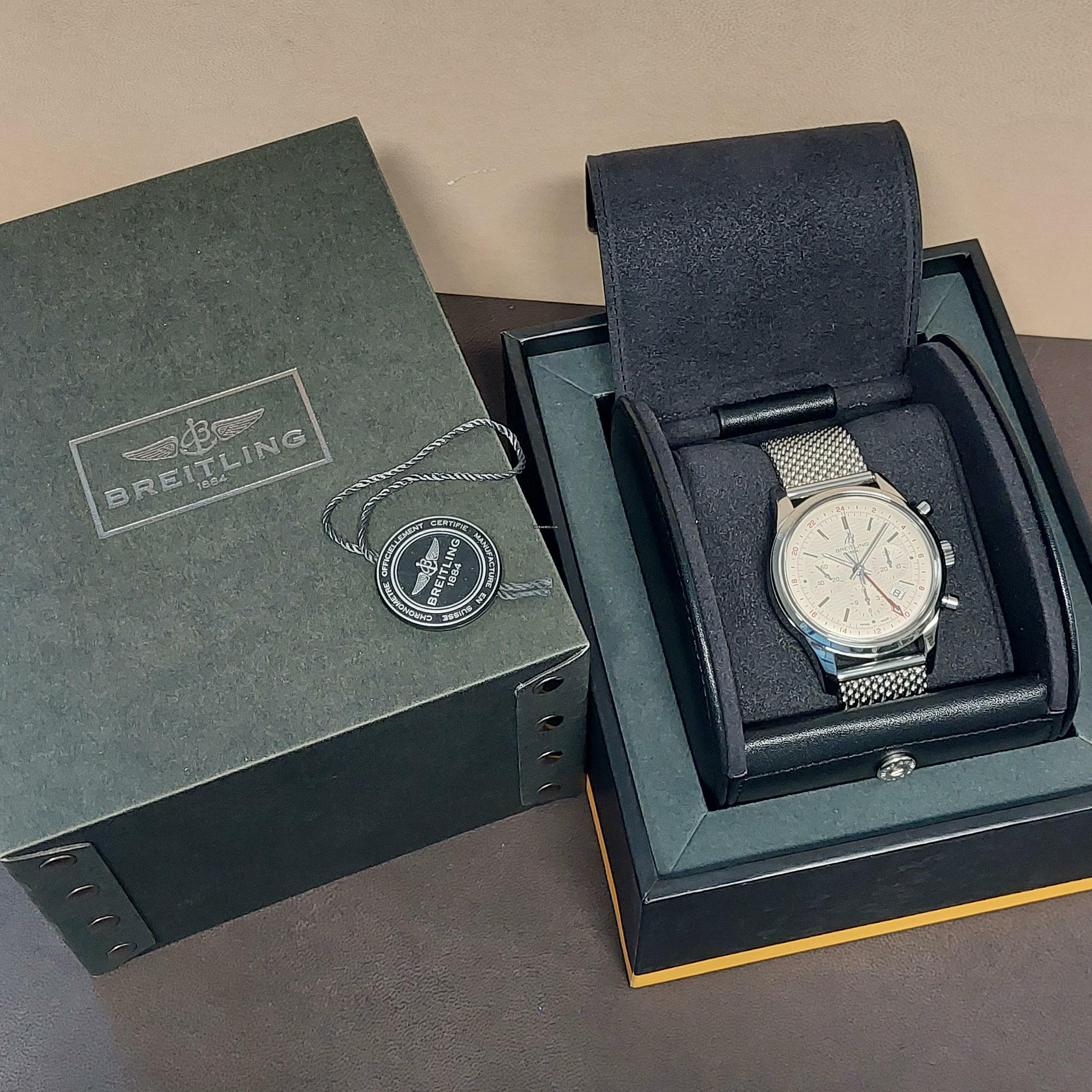 Diese Breitling Uhr verfügt über ein 43 mm Stahlgehäuse. Die Uhr hat ein weißes Zifferblatt. Die Uhr ist mit einem Stahlband ausgestattet.