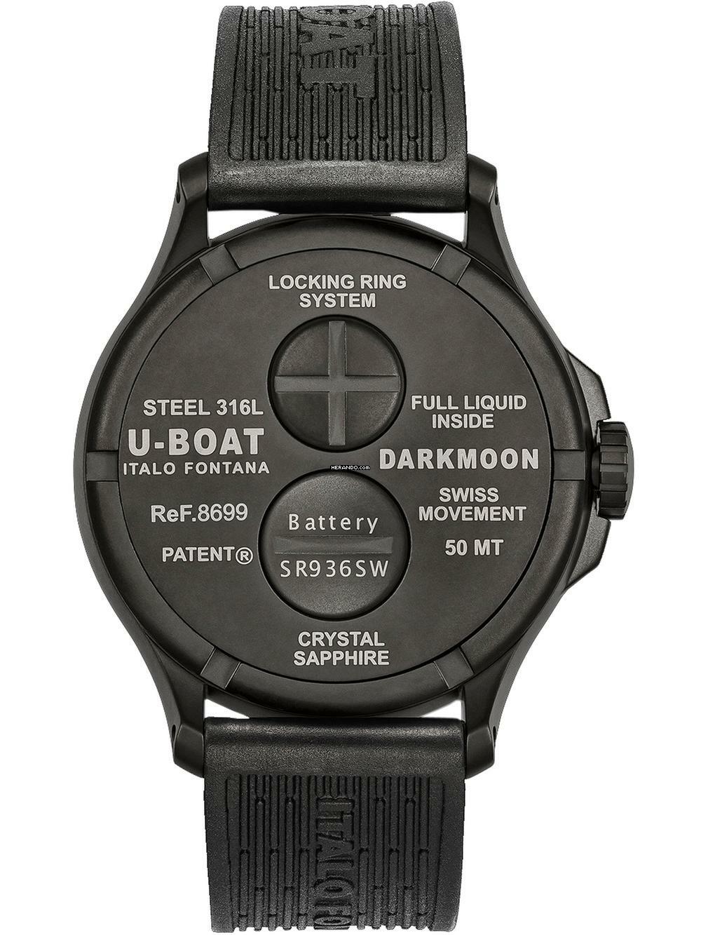 Edelstahl AISI 316L, komplett gefüllt mit einem speziellen Öl, welches das Zifferblatt umhüllt und die Illusion der Abwesenheit von Glas erzeugt, sowie einen optischen Effekt einer höheren Ablesbarkeit. Sichtbare Luftblase auf dem Zifferblatt, um die Temperaturschwankungen auszugleichen. Charakteristische Krone auf der linken Seite. Durchmesser 44 mm.