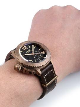 Die Armbanduhr verfügt über ein bronze-farbenes Gehäuse, aus Bronze gefertigt, das durch die Mattierte Oberfläche wie ein echter Eyecatcher wirkt.