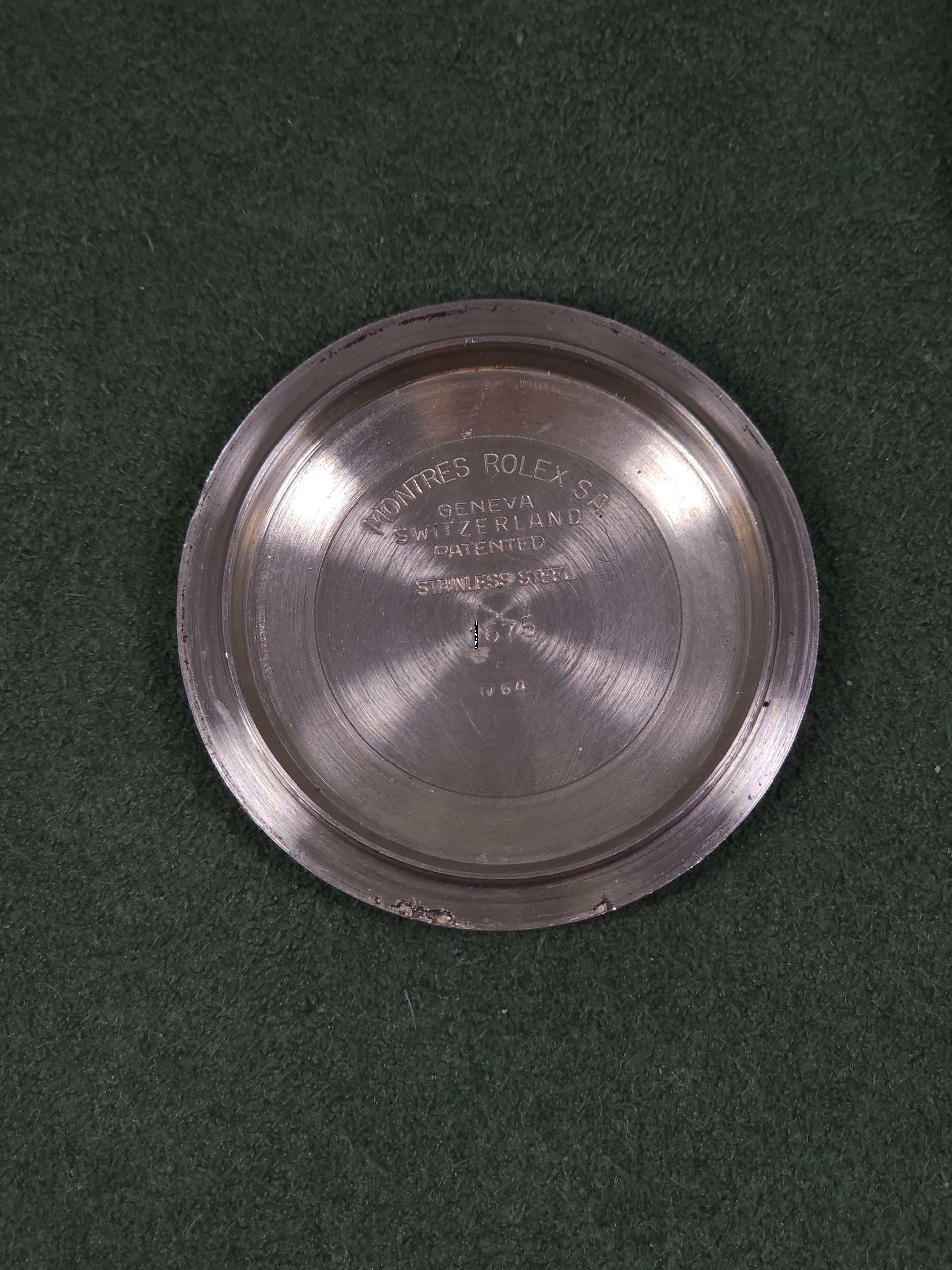 Die Rolex 1675 war auch die erste gmt Master, die Kronenschutzvorrichtungen verwendete. Rolex verwendete bei der 1675 zunächst glänzende Zifferblätter bis etwa 1966 und wechselte dann zu matten Zifferblättern.