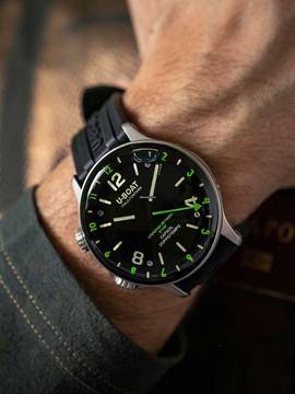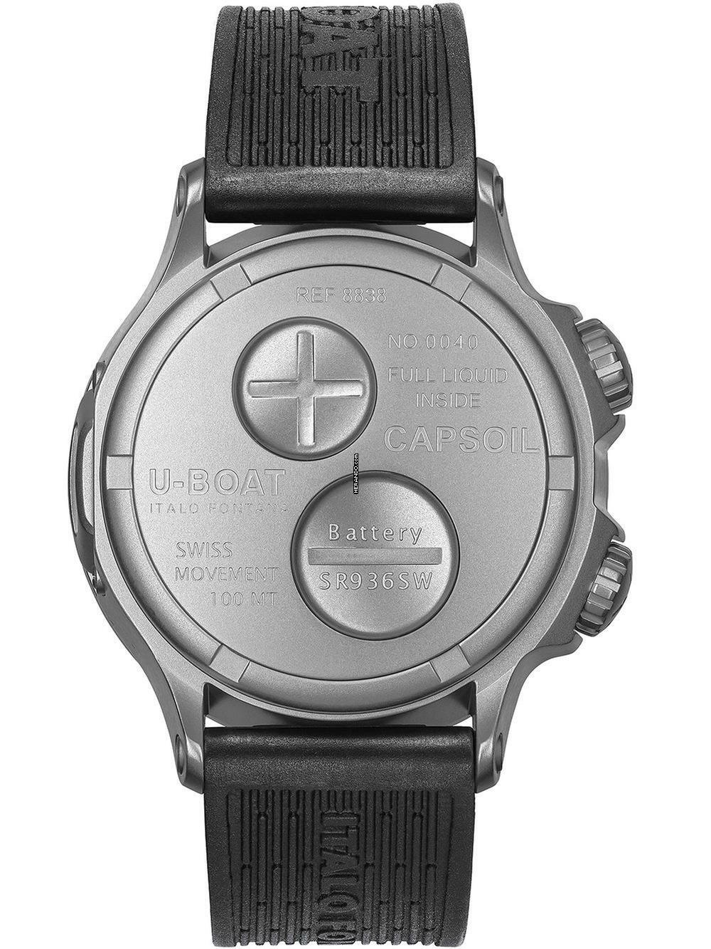Das Herzstück dieses Zeitmessers ist ein Swiss Made Quarz Uhrwerk (mit Batterie), das, wie für U-Boat Uhren üblich, eine präzise Zeitmessung garantiert und folgende Funktionen bereitstellt: Stunde, Minute, GMT, 2 Zeitzonen.