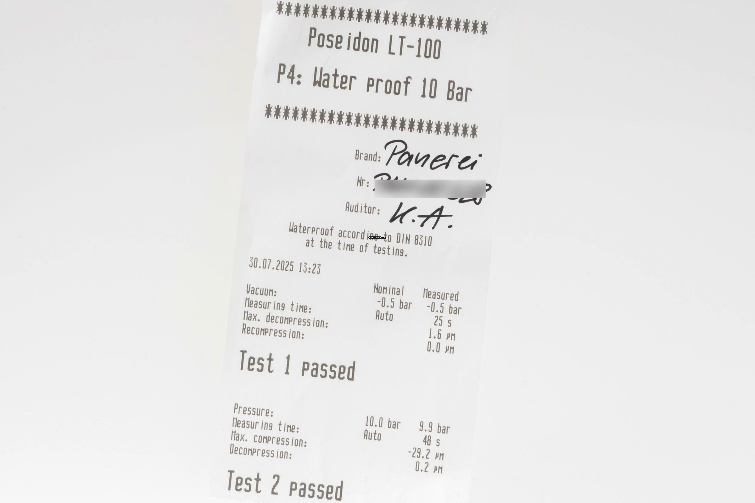 * Wenn die Uhr positiv auf Wasserdichtigkeit getestet wurde, dann gilt diese Eigenschaft zum Zeitpunkt der Messung. Wasserdichtigkeit ist nach DIN 8310 keine bleibende Eigenschaft. Sie sollte jährlich und vor besonderen Belastungen überprüft werden, da die eingebauten Dichtelemente in ihrer Funktion und im täglichen Gebrauch nachlassen. Einflüsse wie starke Temperaturschwankungen, Chlor, Seife oder Salzwasser wirken sich negativ auf die Wasserdichtigkeit aus.
