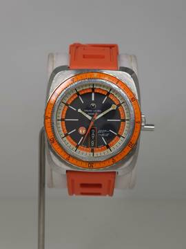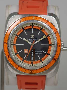 Favre-Leuba stellte 1960 seine erste Taucheruhr vor, und 1963 brachte das Unternehmen ein weiteres Tauchermodell namens Deep Blue auf den Markt. Diese Kollektion umfasste im Laufe der Jahre viele verschiedene Modelle, darunter auch die Uhr, die wir heute hier haben: die Ref. 59973 aus der Mitte der 1960er Jahre. Diese Uhr weist einige ganz besondere Merkmale auf, wie das kissenförmige Gehäuse, das zweifellos ein Design von Favre-Leuba ist, sowie die einzigartige Zeigeranordnung, die für eine bessere Ablesbarkeit sorgt.