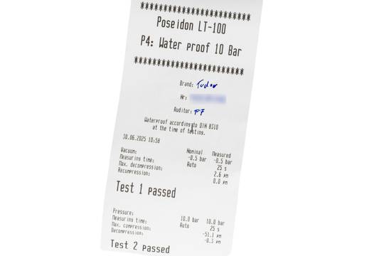 * Wenn die Uhr positiv auf Wasserdichtigkeit getestet wurde, dann gilt diese Eigenschaft zum Zeitpunkt der Messung. Wasserdichtigkeit ist nach DIN 8310 keine bleibende Eigenschaft. Sie sollte jährlich und vor besonderen Belastungen überprüft werden, da die eingebauten Dichtelemente in ihrer Funktion und im täglichen Gebrauch nachlassen. Einflüsse wie starke Temperaturschwankungen, Chlor, Seife oder Salzwasser wirken sich negativ auf die Wasserdichtigkeit aus.