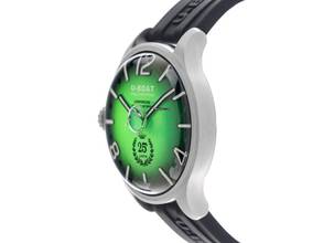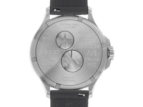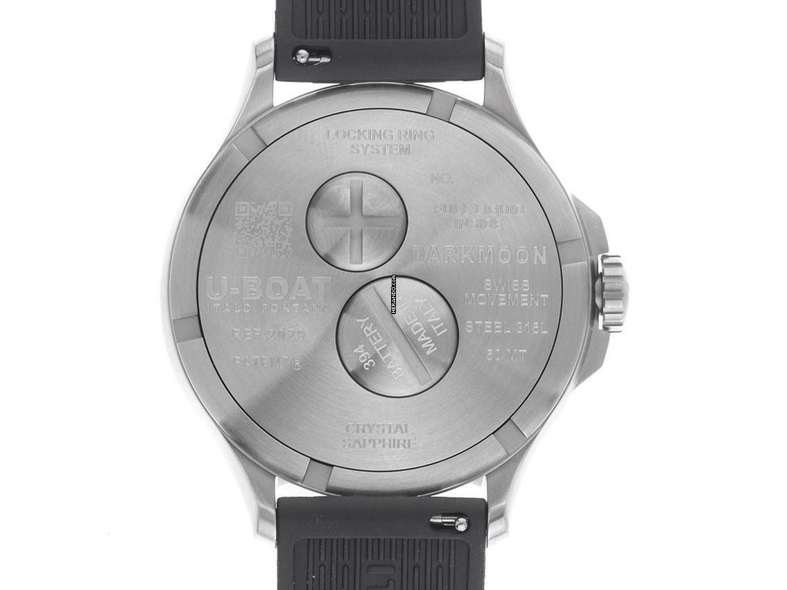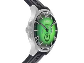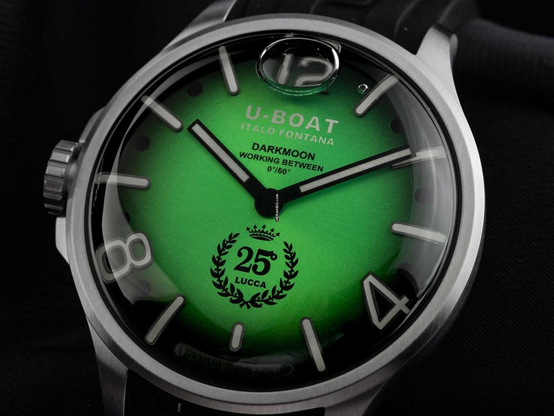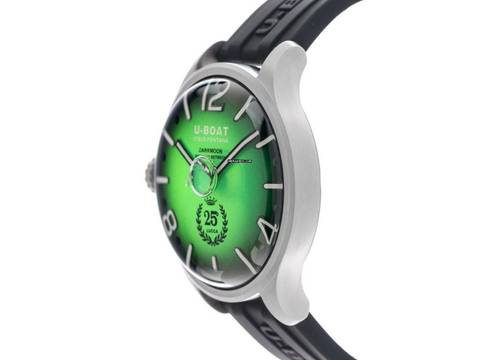 U-Boat Darkmoon Anniversary Stahl elektromechanisch Armband Kautschuk Gehäuse Edelstahl poliert und satiniert, Gehäusedurchmesser ohne Krone 46,5mm, Gehäusehöhe 17,4mm. U-Boat Armband Kautschuk schwarz, Anstoßbreite 21mm, Stiftschließe Edelstahl Edelstahl mit Hersteller-Logo. Zifferblatt grün verlaufend mit arabischen Leuchtziffern und Leuchtindexen sowie schwarzen Leuchtzeigern. Uhr ist mit einem speziellen Öl gefüllt sowie einer Luftblase zum Ausgleich der Temperaturschwankungen. Uhrwerk elektromechanisch, Kaliber U-Boat im Ölbad, arbeitet zwischen 0° und +60°C. Anzeige von Stunde und Minute über Zeiger aus der Mitte. Saphirglas kratzfest und gewölbt. Krone verschraubbar mit Flankenschutz, links bei 9 Uhr. Boden Edelstahl verschraubt und graviert. Gewicht der Uhr inklusive Armband 115g. Wasserdicht 10 ATM. Referenznummer: 2031, ID: ST115417260825H-1450, Artikelnummer: 10000081925. Original U-Boat Box und Garantie Papiere, Full Set. Neu. Limitiert auf 300 Exemplare Lieferzeit sofort. Inklusive certified pre owned Zertifikat / Uhrenpass mit einem Farbbild, der genauen Beschreibung sowie dem Wiederbeschaffungswert der Uhr über 1450,-€ und 1000 Tage Garantie ab Kaufdatum.