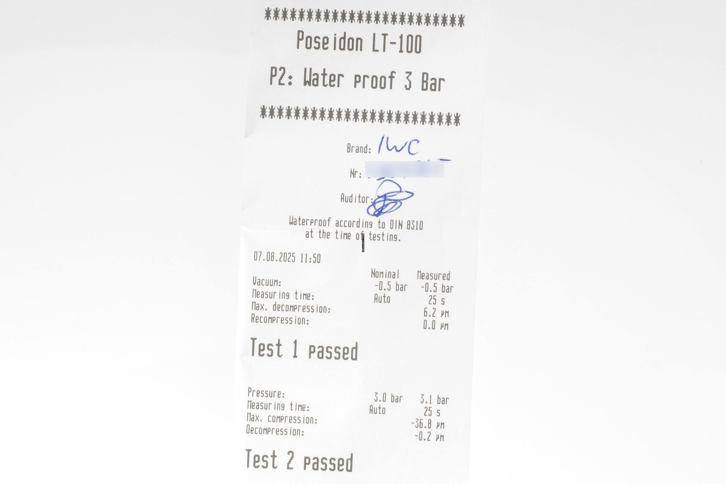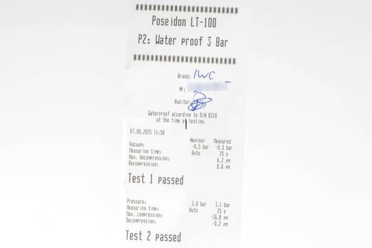 * Wenn die Uhr positiv auf Wasserdichtigkeit getestet wurde, dann gilt diese Eigenschaft zum Zeitpunkt der Messung. Wasserdichtigkeit ist nach DIN 8310 keine bleibende Eigenschaft. Sie sollte jährlich und vor besonderen Belastungen überprüft werden, da die eingebauten Dichtelemente in ihrer Funktion und im täglichen Gebrauch nachlassen. Einflüsse wie starke Temperaturschwankungen, Chlor, Seife oder Salzwasser wirken sich negativ auf die Wasserdichtigkeit aus.