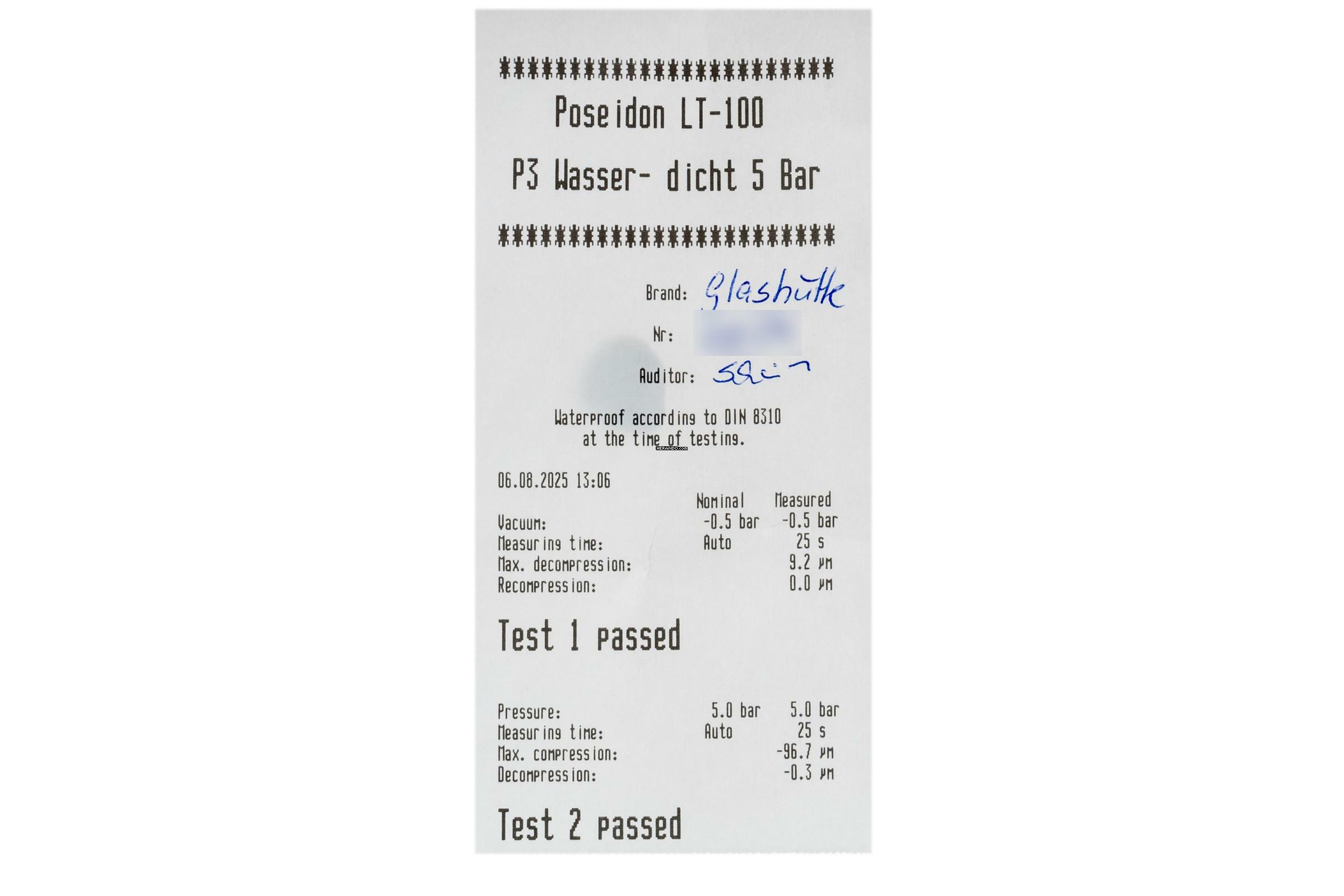 * Wenn die Uhr positiv auf Wasserdichtigkeit getestet wurde, dann gilt diese Eigenschaft zum Zeitpunkt der Messung. Wasserdichtigkeit ist nach DIN 8310 keine bleibende Eigenschaft. Sie sollte jährlich und vor besonderen Belastungen überprüft werden, da die eingebauten Dichtelemente in ihrer Funktion und im täglichen Gebrauch nachlassen. Einflüsse wie starke Temperaturschwankungen, Chlor, Seife oder Salzwasser wirken sich negativ auf die Wasserdichtigkeit aus.
