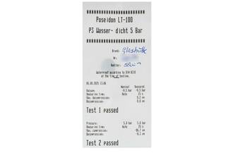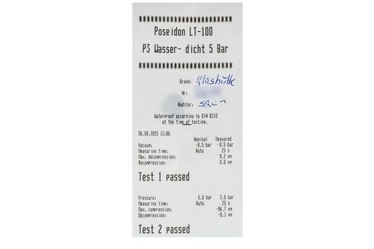 - Wasserdichtigkeit*: ja. Das Prüfprotokoll mit Prüfdruckangabe liegt bei.