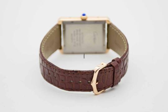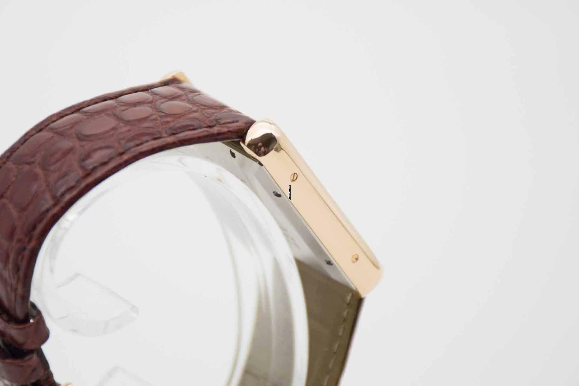 Tank Solo XL 5200026, 31 x 41 mm rosé gold case with silver roman dial and brown Cartier alligator strap with Cartier 18 ct rosé gold buckle. Very elegant Cartier classic in red Cartier box with small signs of storage, service booklet, manual and original Cartier warranty certificate from 2015. This Tank XL is serviced and comes in perfect and mint condition from the first owner.