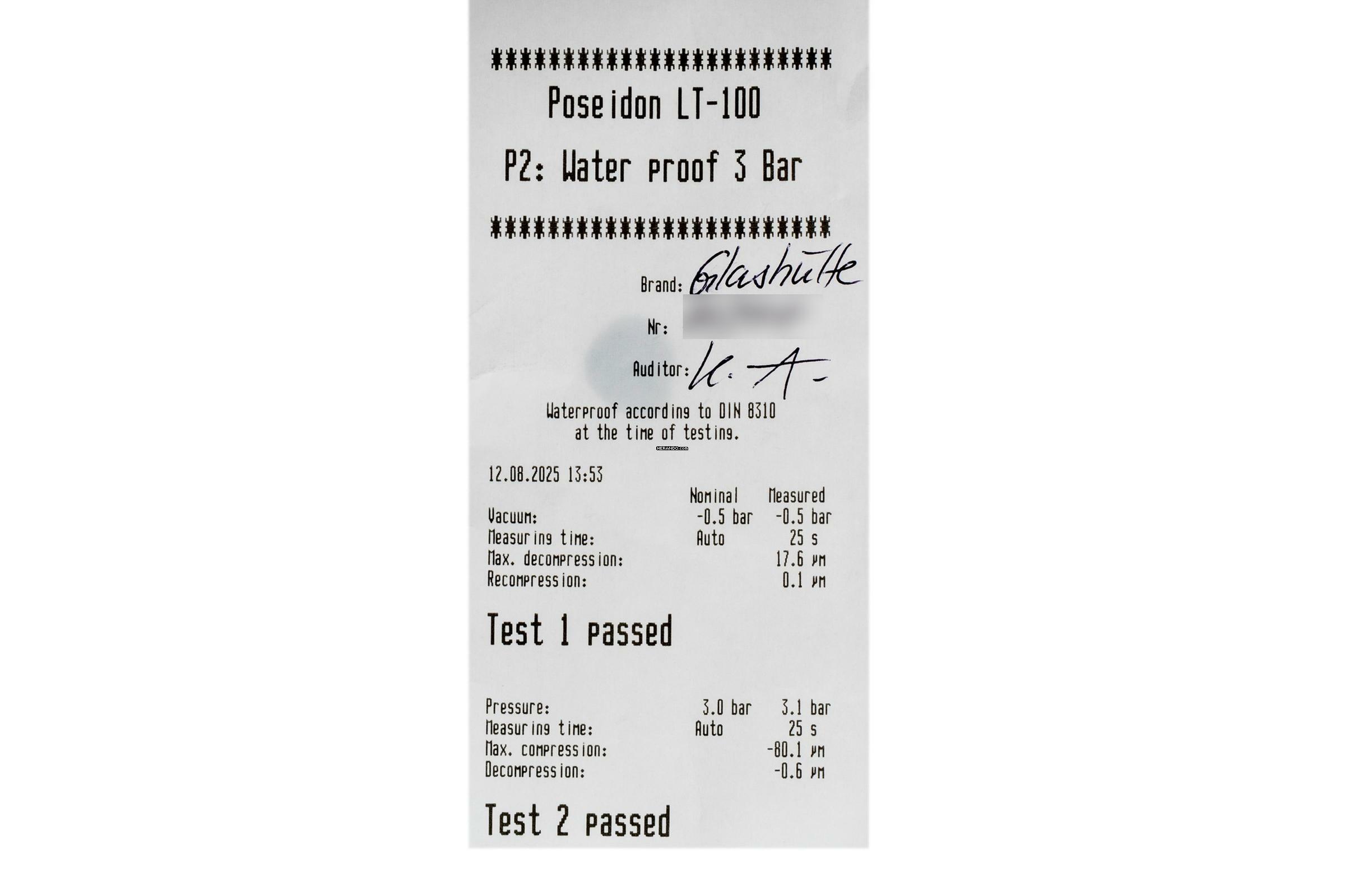 * Wenn die Uhr positiv auf Wasserdichtigkeit getestet wurde, dann gilt diese Eigenschaft zum Zeitpunkt der Messung. Wasserdichtigkeit ist nach DIN 8310 keine bleibende Eigenschaft. Sie sollte jährlich und vor besonderen Belastungen überprüft werden, da die eingebauten Dichtelemente in ihrer Funktion und im täglichen Gebrauch nachlassen. Einflüsse wie starke Temperaturschwankungen, Chlor, Seife oder Salzwasser wirken sich negativ auf die Wasserdichtigkeit aus.