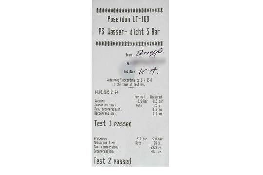 - Wasserdichtigkeit*: ja. Das Prüfprotokoll mit Prüfdruckangabe liegt bei.