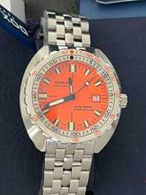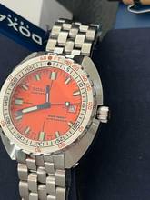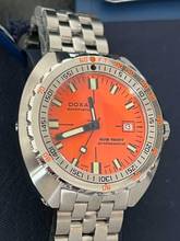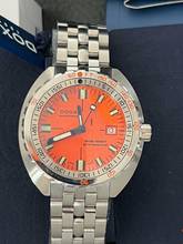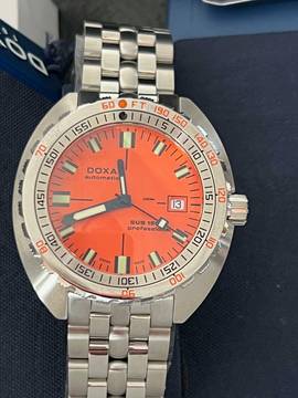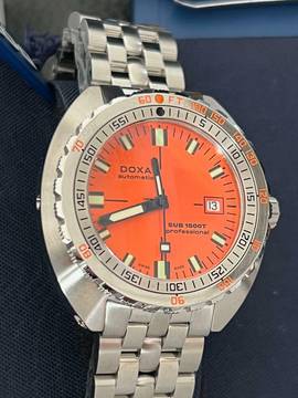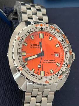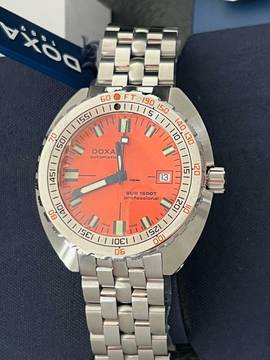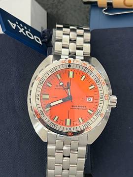 Besonderheiten: Reiskorn-Edelstahlband zum sicheren Sitz mit Schrauben befestigt, Faltschliesse mit Tauchanzugverlängerung, DOXA-Fischsymbol