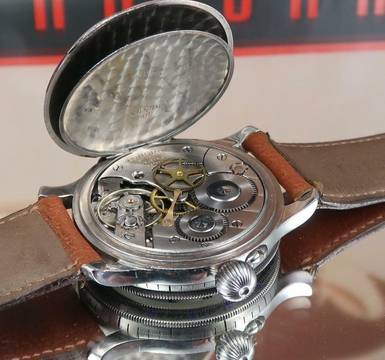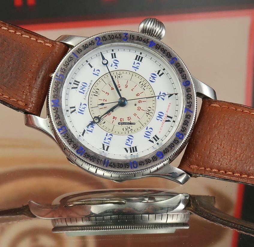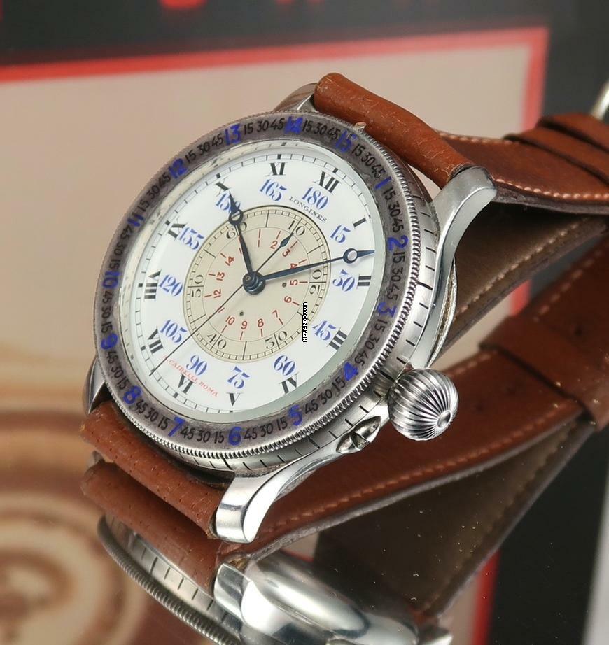 A normal vintage Longines Lindbergh is already rare... but signed A. Cairelli Roma is ultra rare as only 3 exist! These are special pilot watches, invented by Charles A. Lindbergh and introduced in 1932. This is one of the last examples and was supplied to Italy in 1939 and forwarded to A. Cairelli in Rome who supplied watches, timing instuments etc. to the Italian Ministry of the Armed Forces (also by Omega, UG, Zenith eo). It's a big watch, measuring 47mm ex. crown (usually worn over a jacket). The case is steel and the bezel made of silver with beautiful blue enamel numbers. The original enamel dial is beautiful with 3 color print plus the retailers name. The large special movement is Cal. 18.99N and working perfectly. It also comes with a Longines extract. If you want something special, a piece of history plus rarity of only 3 pieces worldwide, this is it!