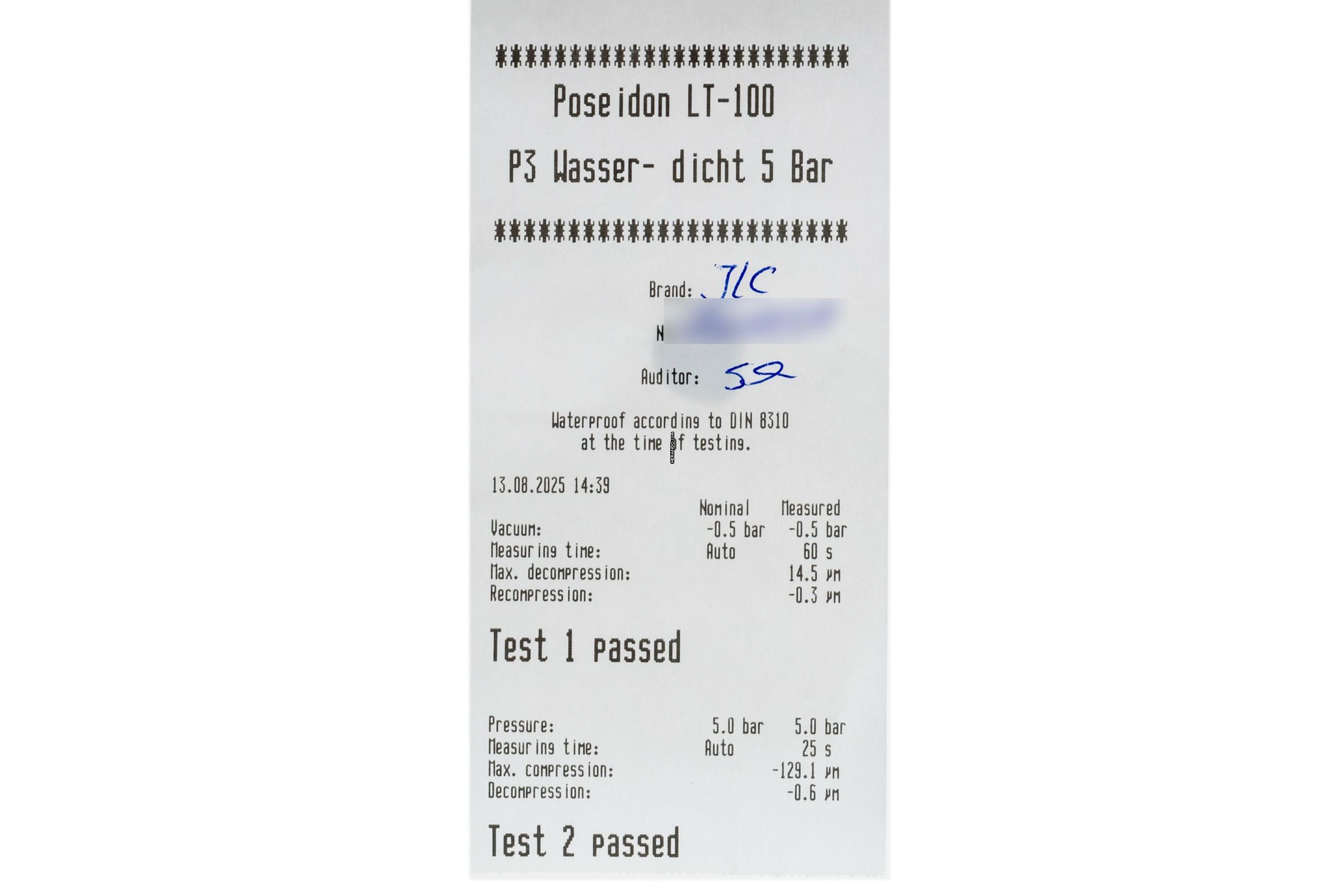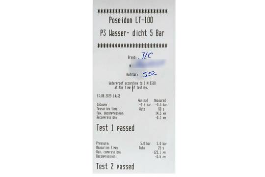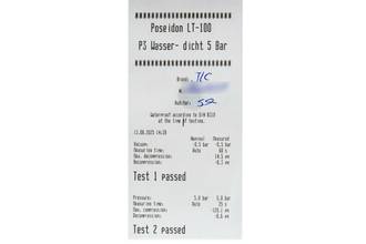 - Wasserdichtigkeit*: ja. Das Prüfprotokoll mit Prüfdruckangabe liegt bei.