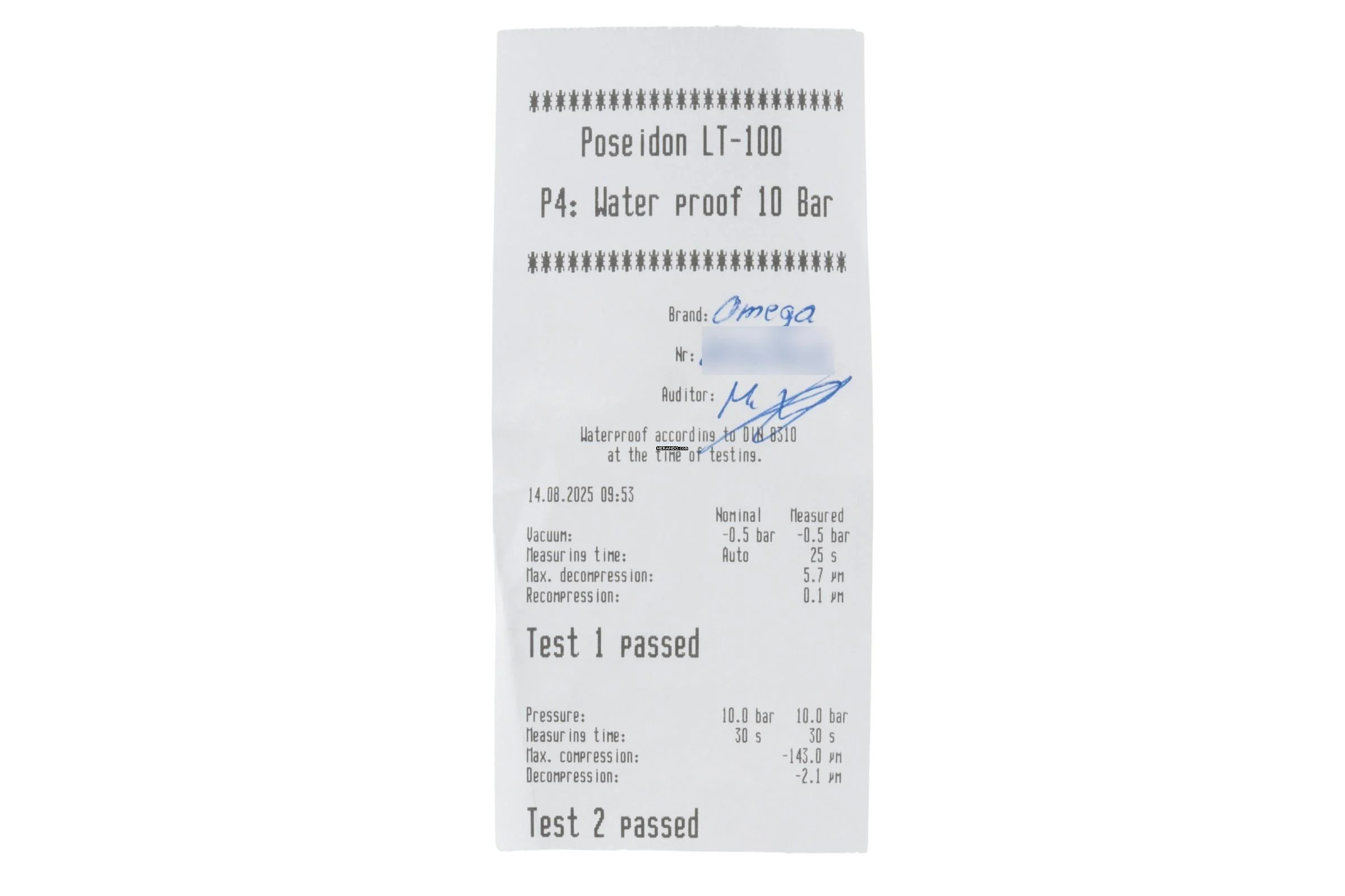 * Wenn die Uhr positiv auf Wasserdichtigkeit getestet wurde, dann gilt diese Eigenschaft zum Zeitpunkt der Messung. Wasserdichtigkeit ist nach DIN 8310 keine bleibende Eigenschaft. Sie sollte jährlich und vor besonderen Belastungen überprüft werden, da die eingebauten Dichtelemente in ihrer Funktion und im täglichen Gebrauch nachlassen. Einflüsse wie starke Temperaturschwankungen, Chlor, Seife oder Salzwasser wirken sich negativ auf die Wasserdichtigkeit aus.