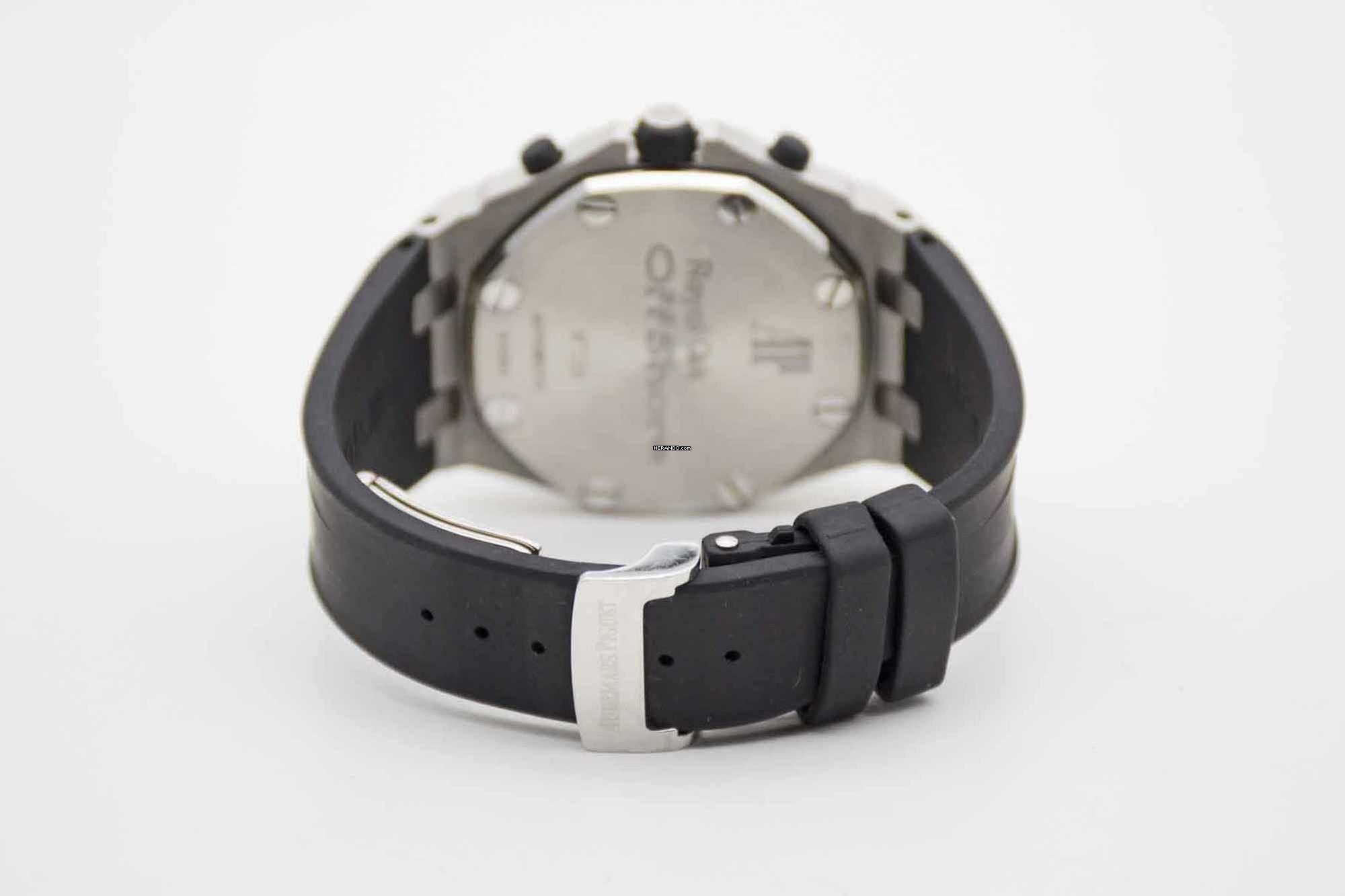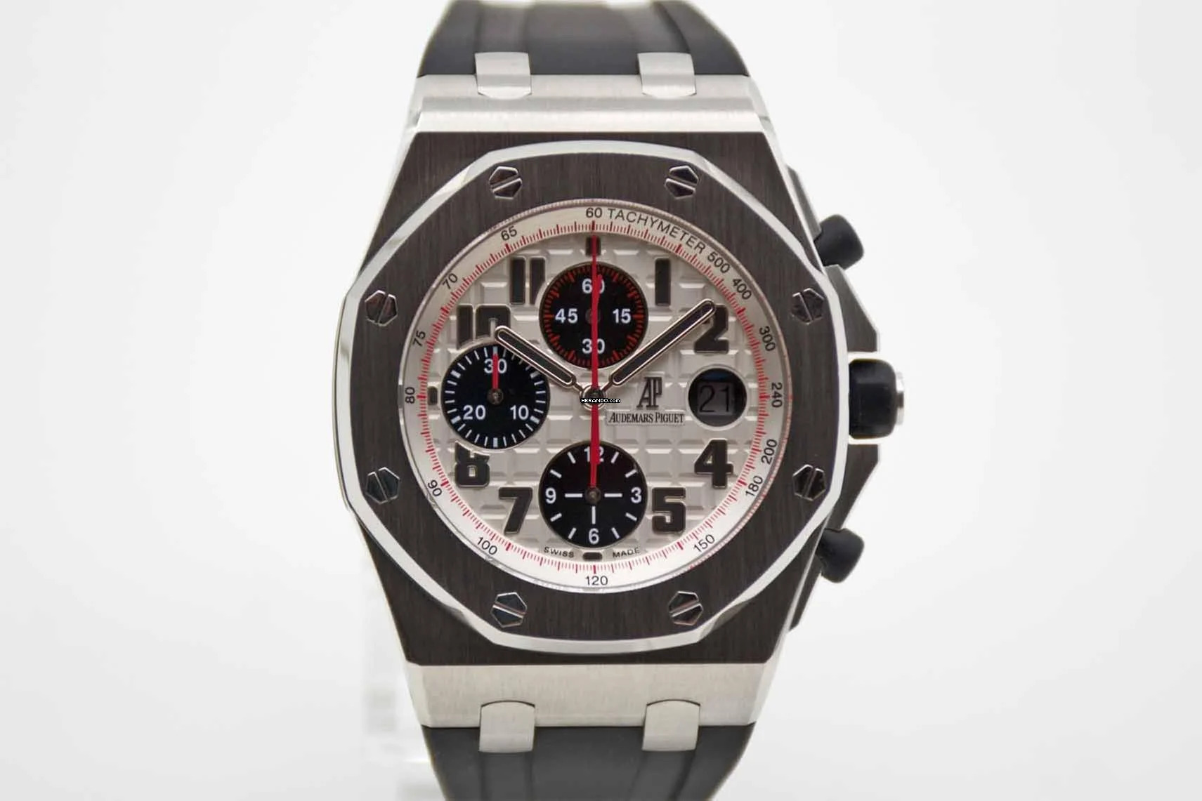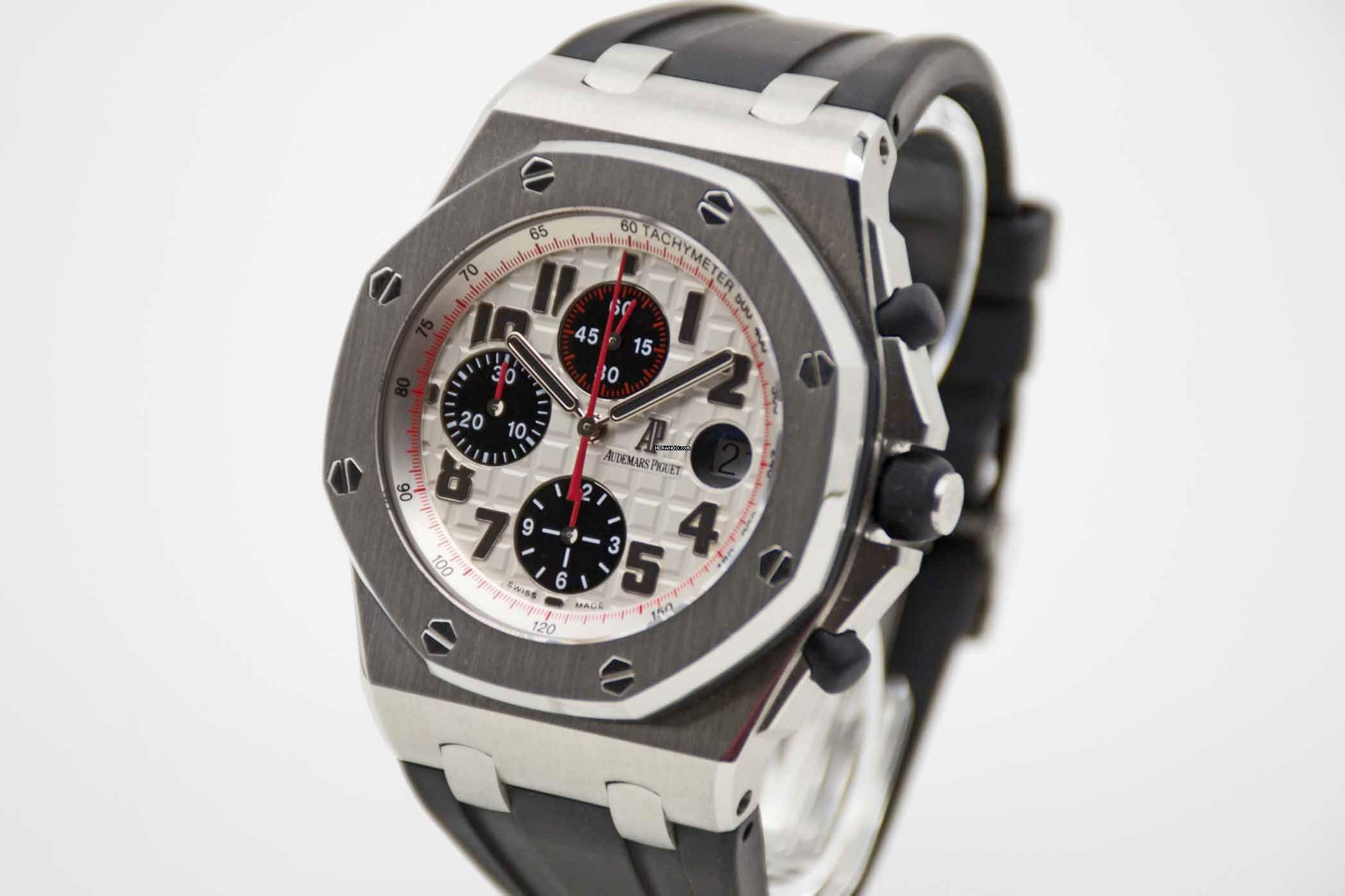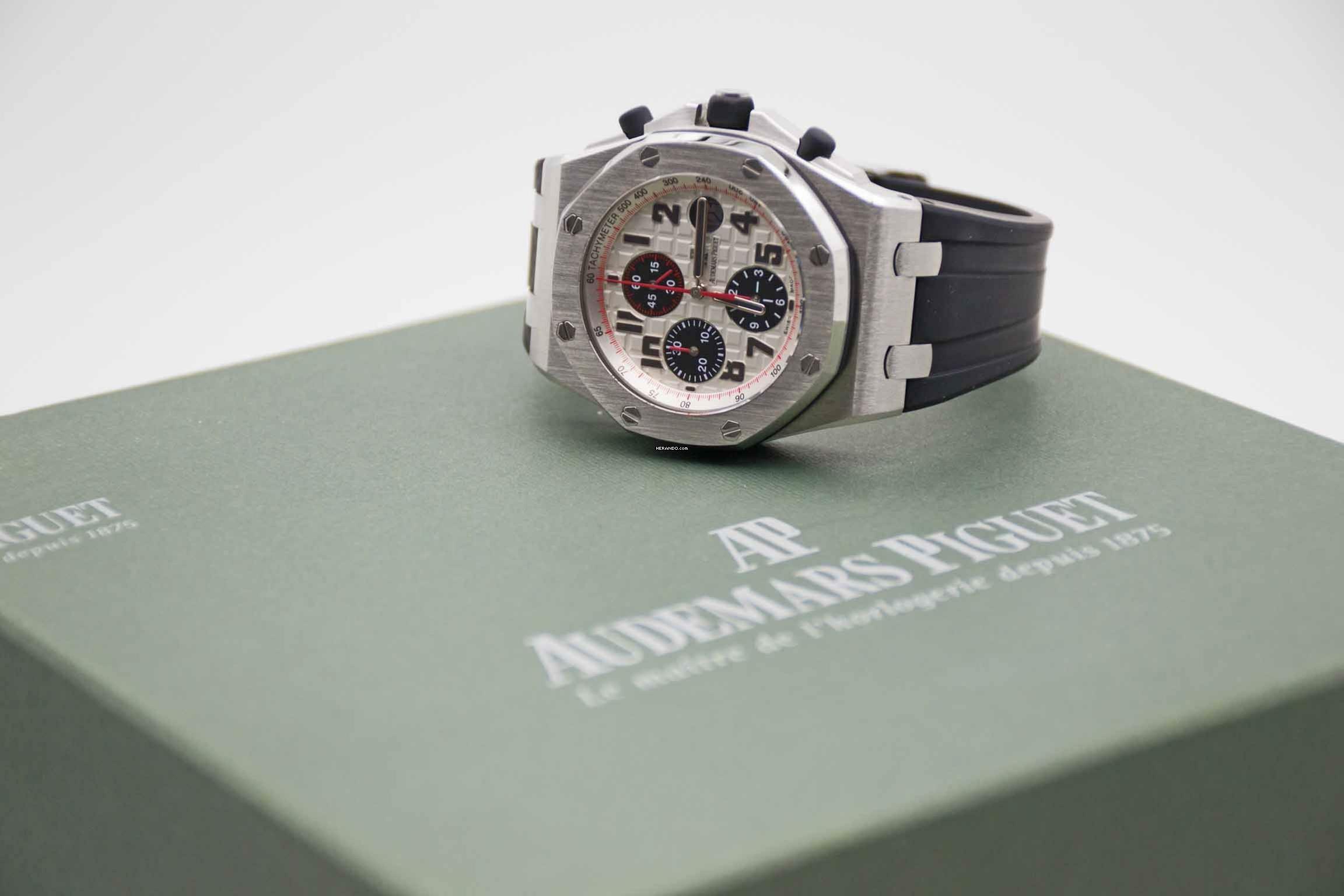 Royal Oak Offshore Chronograph 26170ST.OO.D101CR.02, 42 mm Gehäuse mit perfekter Lünette, silbernem Panda Zifferblatt und schwarzem AP Kautschuk Armband mit AP Faltschließe. Perfektes Fullset in AP Holzbox mit sauberem Inlay und Umkarton, Bedienungsanleitung, Drucktest aus 2024, Garantie Booklet (großer AP Service A in 08/2023 eingetragen) und Audemars Piguet Garantie Zertifikat aus 2010. Dieser Offshor Chrono befindet sich in perfektem und sehr gepflegtem Zustand. Inzahlungnahmen sind nur bei direktem Kontakt möglich. Zu unserer Sicherheit lagern wir sämtliche Uhren unseres Bestandes extern im Banksafe, daher bitten wir um vorherige Terminvereinbarung. Royal Oak Offshore Chronograph 26170ST.OO.D101CR.02, 42 mm case with silver Panda dial, perfect brushed bezel and AP rubber strap with AP folding clasp. Full set in AP inner and outer box with clean inlay, Offshore owners manual, pressure test receipt (2024), AP warranty booklet (with AP Service A stamped in 08/2023) and Audemars Piguet warranty certificate from 2010. The watch comes in perfect and mint condition. Trades are possible if you contact us in advance. Please keep in mind that our complete inventory is stored in our bank safe for safety purposes.