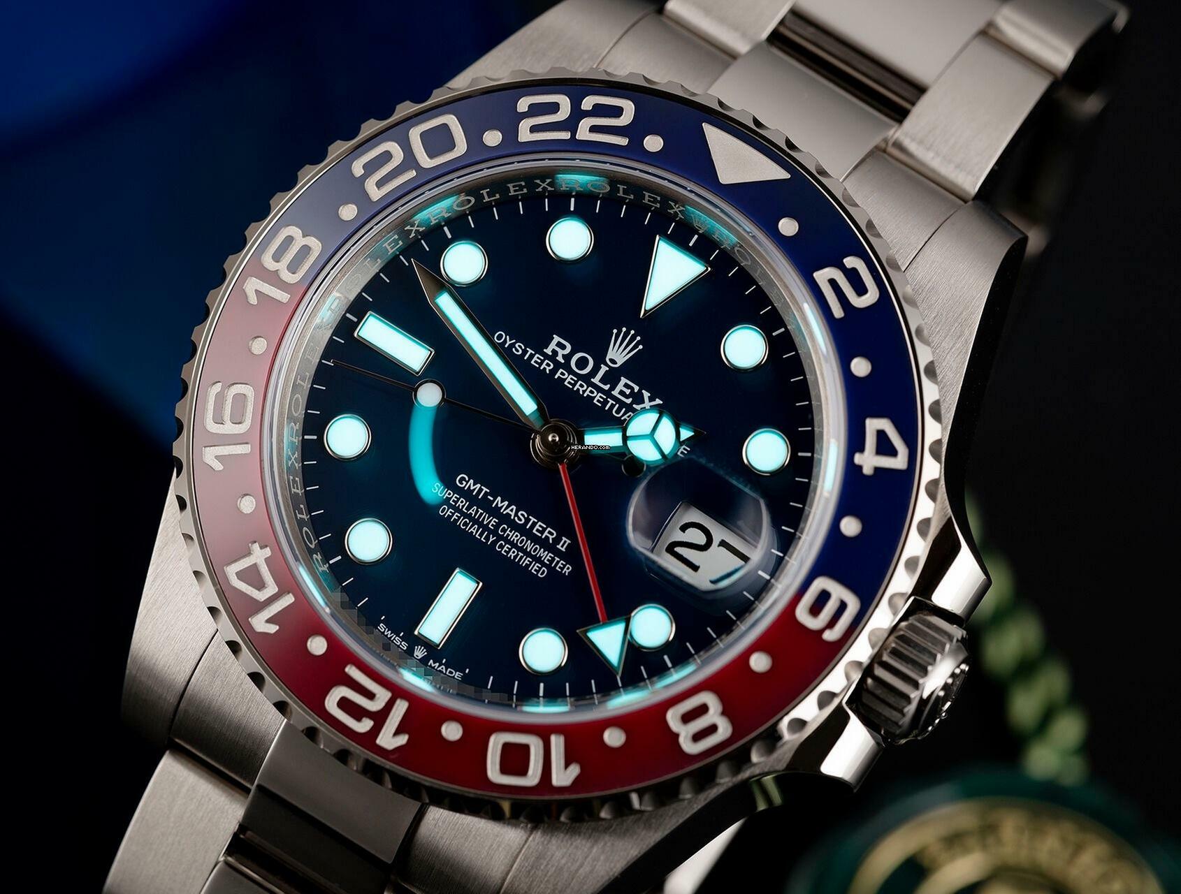Angetrieben von dem hochmodernen Automatikwerk Kaliber 3285 von Rolex, bietet die 126719BLRO eine präzise Zeitmessung und eine Funktion für zwei Zeitzonen, was sie zum perfekten Begleiter für Weltreisende macht. Das blaue Zifferblatt mit Sonnenschliff bildet einen schönen Kontrast zu den leuchtenden Stundenmarkierungen und den Zeigern im Mercedes-Stil, die für optimale Ablesbarkeit unter allen Bedingungen sorgen.