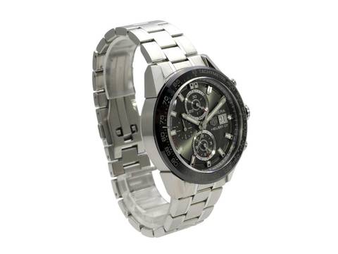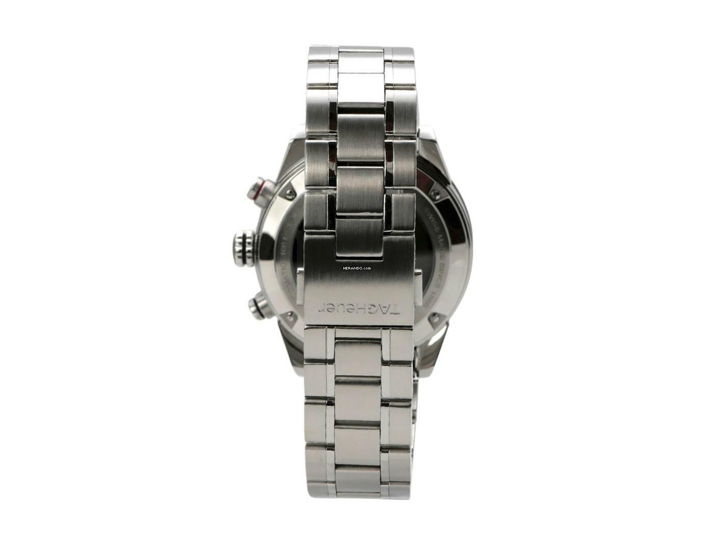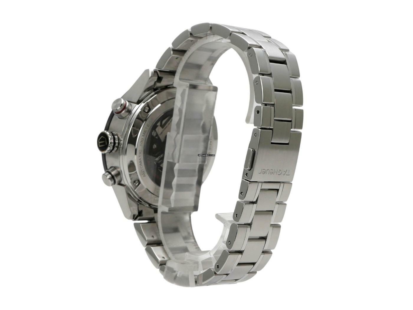 Gehäuse aus Edelstahl, Gehäusedurchmesser 43 mm, schwarze Keramiklünette mit Tachymeterskala, Edelstahlband mit Faltschließe, graues Zifferblatt mit aufgesetzten Leuchtindexen, Leuchtzeiger, Automatikwerk, Chronograph, Kaliber Tag Heuer 01, kleine Sekunde auf der 9-Uhr-Position, Datumsanzeige, entspiegeltes Saphirglas, Edelstahlboden mit Saphirglas-Sichtfenster, wasserdicht bis zu 10 bar.