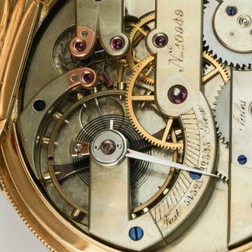 Werk: hochfeines großes Nickel Brückenwerk von 20''' Linien, goldenes Laufwerk, 21 Rubinlagersteine mit Olivenschliff, zwei davon sind gelagert in Rotgold, Lepine Typ Index Feinregulage mit langem Zeiger mit Jürgensen`s Scala auf der Mittelradbrücke. Jürgensen Kolbenzahn-Ankerhemmung aus Stahl mit langer Gabel, offenen Rubin Paletten und ringförmigem Ausgleichsgewicht, geteilte Federhausbrücke und wolfverzahnte Aufzugsräder. Gebläute Breguet Spirale mit Endkurve. Große Goldschrauben Kompensation Unruh. Ébauche/Rohwerk von Piguet Frères. Das saubere Werk ist in sehr schönem, voll funktionsfähigem Zustand mit einer täglichen Gang-Abweichung von wenigen Sekunden.