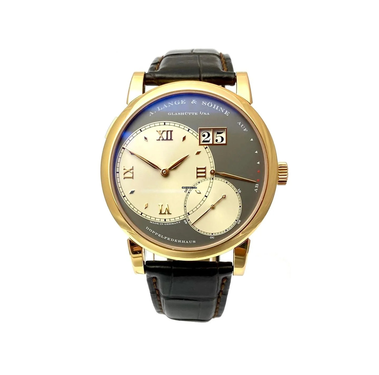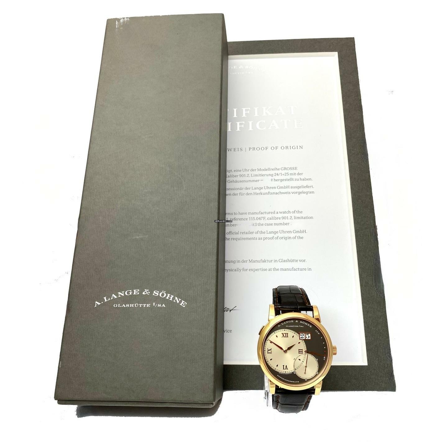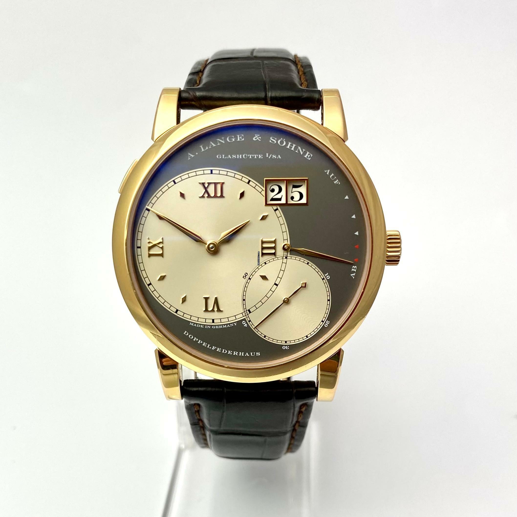 Die Uhr wird mit der A. Lange & Söhne Service-Box und A. Lange & Söhne Echtheitszertifikat geliefert.