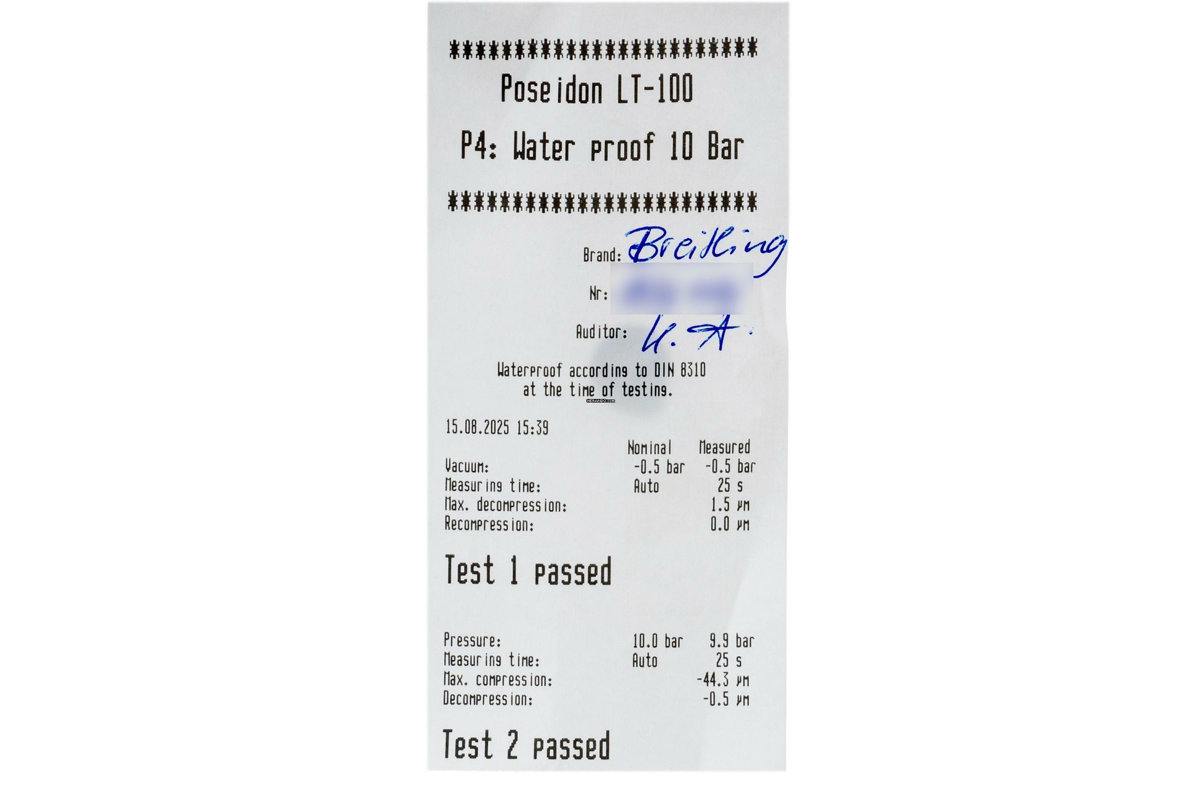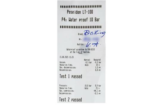 * Wenn die Uhr positiv auf Wasserdichtigkeit getestet wurde, dann gilt diese Eigenschaft zum Zeitpunkt der Messung. Wasserdichtigkeit ist nach DIN 8310 keine bleibende Eigenschaft. Sie sollte jährlich und vor besonderen Belastungen überprüft werden, da die eingebauten Dichtelemente in ihrer Funktion und im täglichen Gebrauch nachlassen. Einflüsse wie starke Temperaturschwankungen, Chlor, Seife oder Salzwasser wirken sich negativ auf die Wasserdichtigkeit aus.