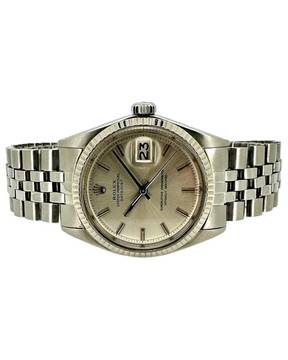 Die Rolex Oyster Perpetual Datejust Referenz 1601 aus dem Jahr 1970 ist ein wahrer Klassiker und ein begehrtes Sammlerstück für Liebhaber von Vintage-Uhren. Mit einem 36 mm Gehäusedurchmesser und einer eleganten 18k Weißgold-Lünette verkörpert sie zeitlose Eleganz und Raffinesse. Das Zifferblatt mit den markanten Stundenmarkierungen und eleganten Zeigern verleiht der Uhr einen einzigartigen Charakter und hebt sie von anderen Modellen ab.Das gefaltete Jubilee-Band sorgt für einen perfekten Sitz am Handgelenk und ergänzt den edlen Look dieser ikonischen Uhr. Im Inneren arbeitet das zuverlässige und präzise Automatikkaliber 1570, ein Werk, das für seine Langlebigkeit und Präzision geschätzt wird.Die Rolex Datejust 1601 ist nicht nur ein stilvoller Begleiter für jede Gelegenheit, sondern auch ein Stück Uhrengeschichte. Ein Muss für Sammler und Kenner, die Wert auf Qualität, Stil und Exklusivität legen.