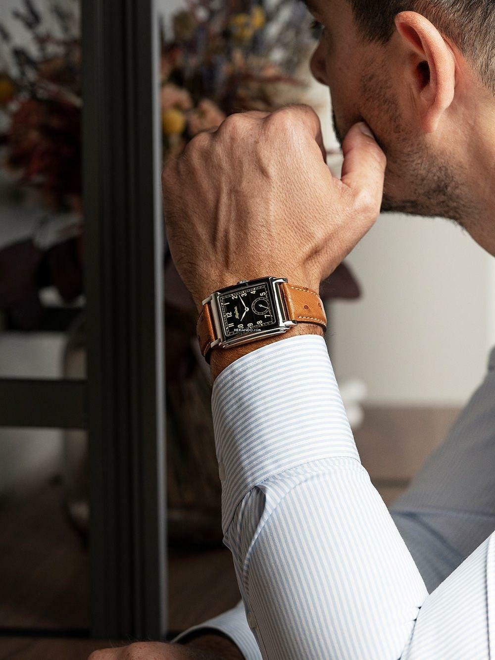 Das Rechtecke Gehäuse ist 33 mm breit sowie 12 mm hoch und schmückt, natürlich abhängig vom individuellen Geschmack, nahezu jedes Handgelenk. Vom Gehäuse hebt sich die Feststehende Lünette dezent ab. Beim Gehäuseboden der Uhr handelt es sich um einen Glasboden, verschraubt, der den Schlusspunkt für ein ansprechendes Design setzt.