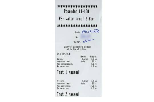 - Wasserdichtigkeit*: ja. Das Prüfprotokoll mit Prüfdruckangabe liegt bei.