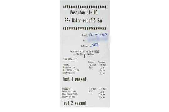 * Wenn die Uhr positiv auf Wasserdichtigkeit getestet wurde, dann gilt diese Eigenschaft zum Zeitpunkt der Messung. Wasserdichtigkeit ist nach DIN 8310 keine bleibende Eigenschaft. Sie sollte jährlich und vor besonderen Belastungen überprüft werden, da die eingebauten Dichtelemente in ihrer Funktion und im täglichen Gebrauch nachlassen. Einflüsse wie starke Temperaturschwankungen, Chlor, Seife oder Salzwasser wirken sich negativ auf die Wasserdichtigkeit aus.