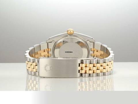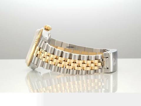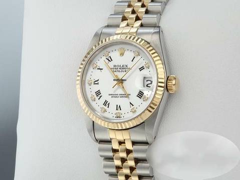 Diese wunderschöne Rolex ist aus Edelstahl in Kombination mit feinstem Gelbgold 750 gefertigtFantastisches und seltenes weisses Zifferblatt mit schwarzen römischen Zahlen und 10 strahlenden Diamanten besetzt, original von Rolex