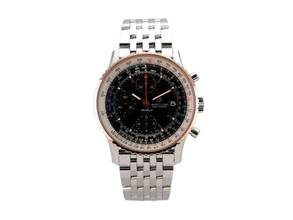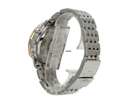 Gehäuse aus Edelstahl poliert, Gehäusedurchmesser 41 mm, Gehäusehöhe 14,44 mm, Rotgold Lünette gerädelt mit Rechenschieber, beidseitig drehbar, Edelstahlband mit Faltschließe, schwarzes Zifferblatt mit aufgesetzten Leuchtindexen, Rotgold Leuchtzeiger, Automatikwerk, Breitling 13 mit 25 Steine, 28.800 A/h, Gangreserve ca. 42 Stunden, Datumsanzeige, Chronometer mit Zeugnis, Saphirglas doppelseitig entspiegelt, Edelstahlboden verschraubt und graviert, wasserdicht bis zu 3 bar.