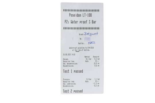 * Wenn die Uhr positiv auf Wasserdichtigkeit getestet wurde, dann gilt diese Eigenschaft zum Zeitpunkt der Messung. Wasserdichtigkeit ist nach DIN 8310 keine bleibende Eigenschaft. Sie sollte jährlich und vor besonderen Belastungen überprüft werden, da die eingebauten Dichtelemente in ihrer Funktion und im täglichen Gebrauch nachlassen. Einflüsse wie starke Temperaturschwankungen, Chlor, Seife oder Salzwasser wirken sich negativ auf die Wasserdichtigkeit aus.