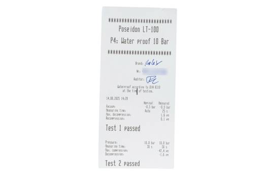 * Wenn die Uhr positiv auf Wasserdichtigkeit getestet wurde, dann gilt diese Eigenschaft zum Zeitpunkt der Messung. Wasserdichtigkeit ist nach DIN 8310 keine bleibende Eigenschaft. Sie sollte jährlich und vor besonderen Belastungen überprüft werden, da die eingebauten Dichtelemente in ihrer Funktion und im täglichen Gebrauch nachlassen. Einflüsse wie starke Temperaturschwankungen, Chlor, Seife oder Salzwasser wirken sich negativ auf die Wasserdichtigkeit aus.