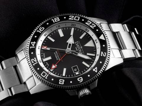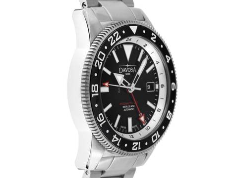 Davosa Argonautic World Traveller Stahl Keramik Automatik Armband Stahl Gehäuse Edelstahl satiniert und poliert, Gehäusedurchmesser ohne Krone 41mm, Gehäusehöhe 11,9mm. Lünette Edelstahl geriffelt mit schwarzem Keramik Inlay und 24-Stunden Skala, beidseitig drehbar. Armband Edelstahl satiniert, Sicherheitsfaltschließe Edelstahl mit Hersteller-Logo. Zifferblatt schwarz mit aufgesetzten Leuchtindexen und Leuchtzeigern und Unterglas 24-Stunden Skala. Uhrwerk Automatik, Kaliber DAV 3032 mit 21 Edelsteinen, Gangreserve ca. 56 Stunden. Anzeige von Stunde, Minute und Sekunde über Zeiger aus der Mitte mit Sekundenstopp zur sekundengenauen Einstellung der Uhrzeit, Datumsanzeige mit Schnellverstellung bei 3 Uhr, zweite Zeitzone über roten Zeiger mit Leuchtspitze aus der Mitte. Saphirglas kratzfest und entspiegelt. Krone verschraubbar mit Flankenschutz und Hersteller-Logo. Boden Edelstahl verschraubt und graviert. Gewicht der Uhr inklusive Armband 174g, Länge des Armbandes inklusive Gehäuse 210mm. Wasserdicht bis 20 ATM. Referenznummer: 161.542.50, ID: ST115618920925H-1590, Artikelnummer: 10000082265. Original Davosa Box mit Umkarton und Garantie Papiere sowie Beschreibung, Full Set. Neu. Lieferzeit sofort. Inklusive Uhrenpass mit einem Farbbild, der genauen Beschreibung sowie dem Wiederbeschaffungswert der Uhr über 1590,-€ und 1000 Tage Garantie ab Kaufdatum.