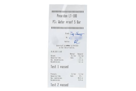 * Wenn die Uhr positiv auf Wasserdichtigkeit getestet wurde, dann gilt diese Eigenschaft zum Zeitpunkt der Messung. Wasserdichtigkeit ist nach DIN 8310 keine bleibende Eigenschaft. Sie sollte jährlich und vor besonderen Belastungen überprüft werden, da die eingebauten Dichtelemente in ihrer Funktion und im täglichen Gebrauch nachlassen. Einflüsse wie starke Temperaturschwankungen, Chlor, Seife oder Salzwasser wirken sich negativ auf die Wasserdichtigkeit aus.