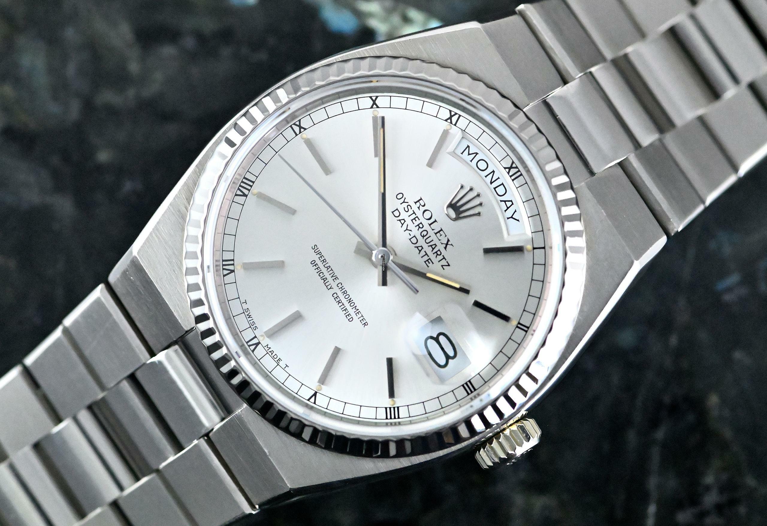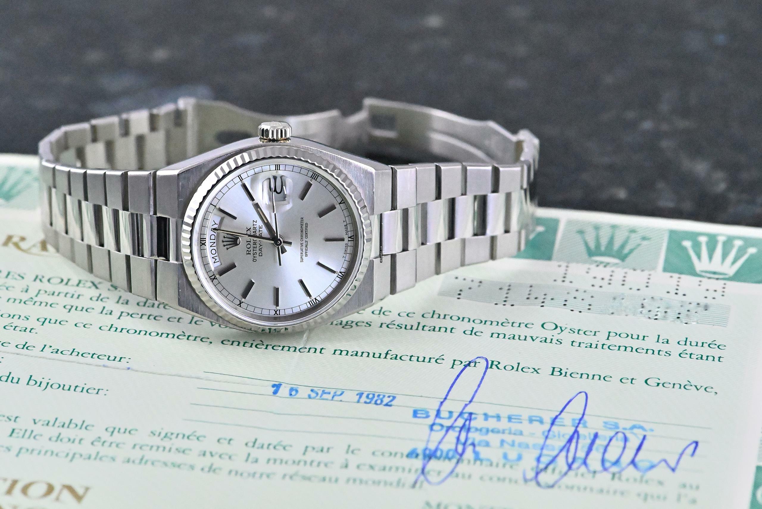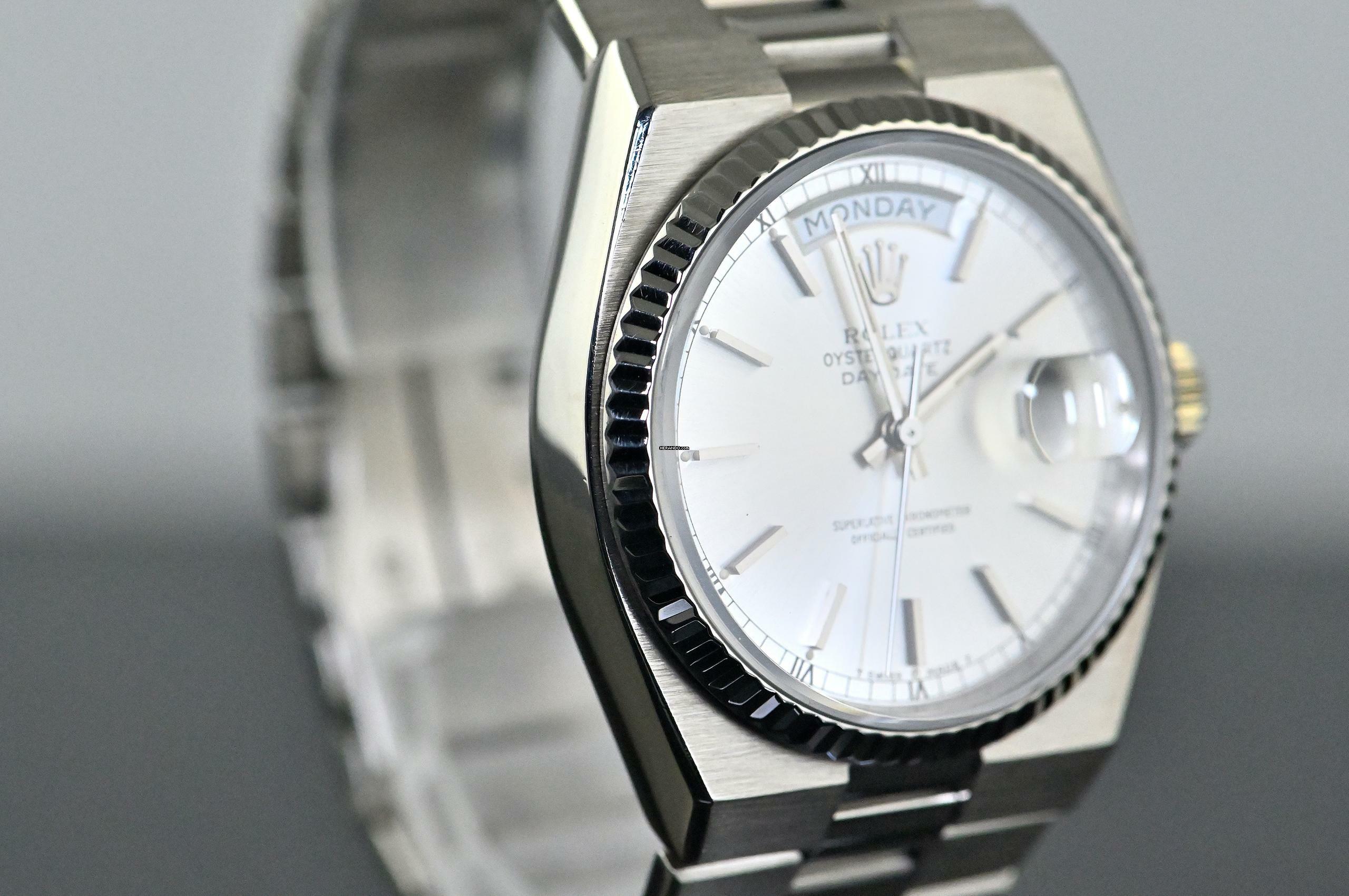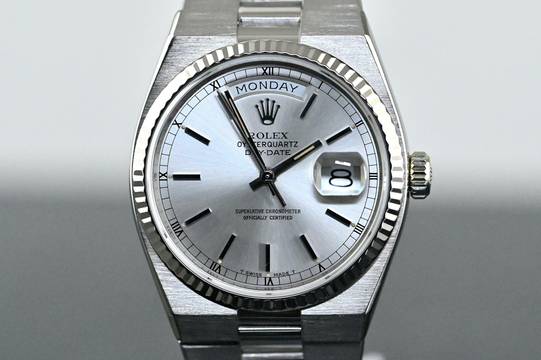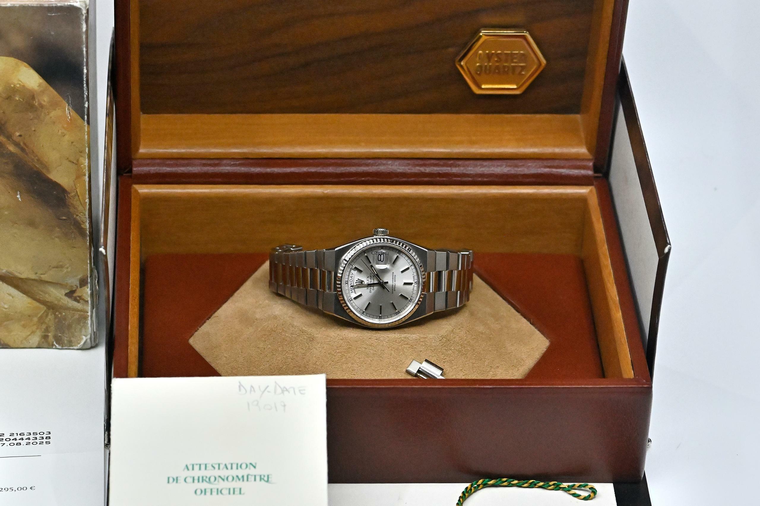 Very rare and special Vintage Rolex Day-Date Oysterquartz | reference 19019 | in 18k white gold | serial number 7,148,xxx | produced in 1981 | Rolex Quartz calibre 5055, which has had its battery recently replaced | undervalued for many years, but in recent years it has been receiving more and more of the attention it deserves | the new Rolex model: the Landweller, has also contributed to the popularity of the Vintage Oysterquartz models from the 1970s and 1980s | this version is the rare and sought after white gold model, which is a lot rarer than the yellow gold version | original silver dial with original hands | very good condition and together with the set, this package is an absolute dream for any collector | original white gold bracelet (with minimal stretch) with a folding clasp in 18k white gold | bracelet currently has an inner circumference of approx. 17.5 cm | another dismantled element enclosed which can be screwed into the bracelet if required | total weight approx. 155.3 grams | enclosed original Oysterquartz box with matching outer carton - original warranty certificate (sold in 1982 in Lugano, Switzerland) - Oysterquartz booklet - chronometer translation - pocket calendar from 1982 - chronometer hang tag - Wempe invoice from August 2025 for inspection of the movement and water resistance, as well as battery replacement. An Oysterquartz Day-Date in white gold in this set and condition is a special piece for any Rolex vintage enthusiast and is sure to make many hearts beat faster!