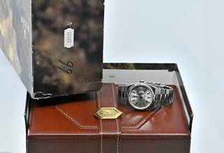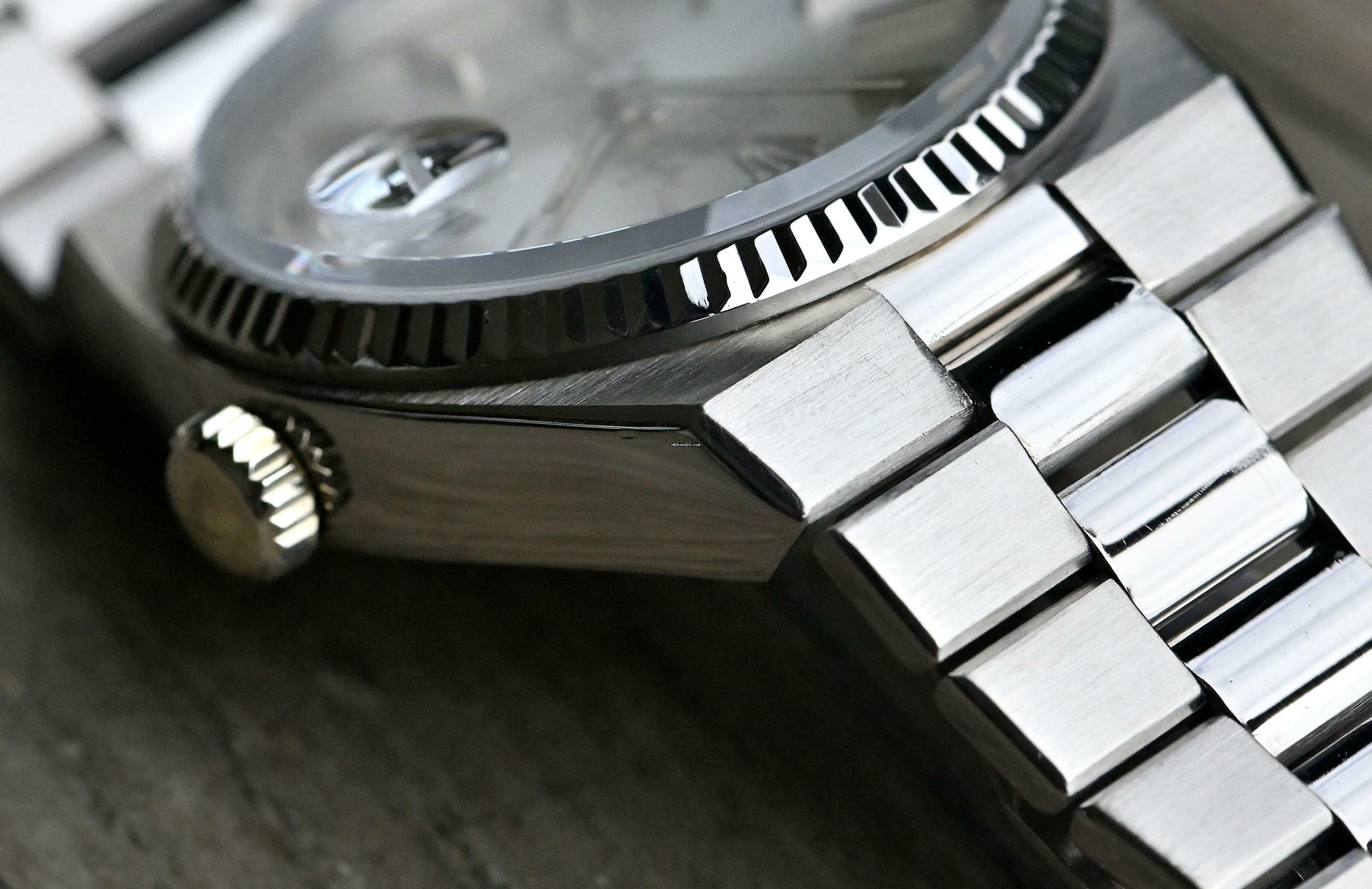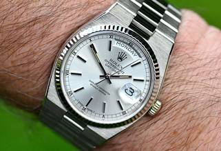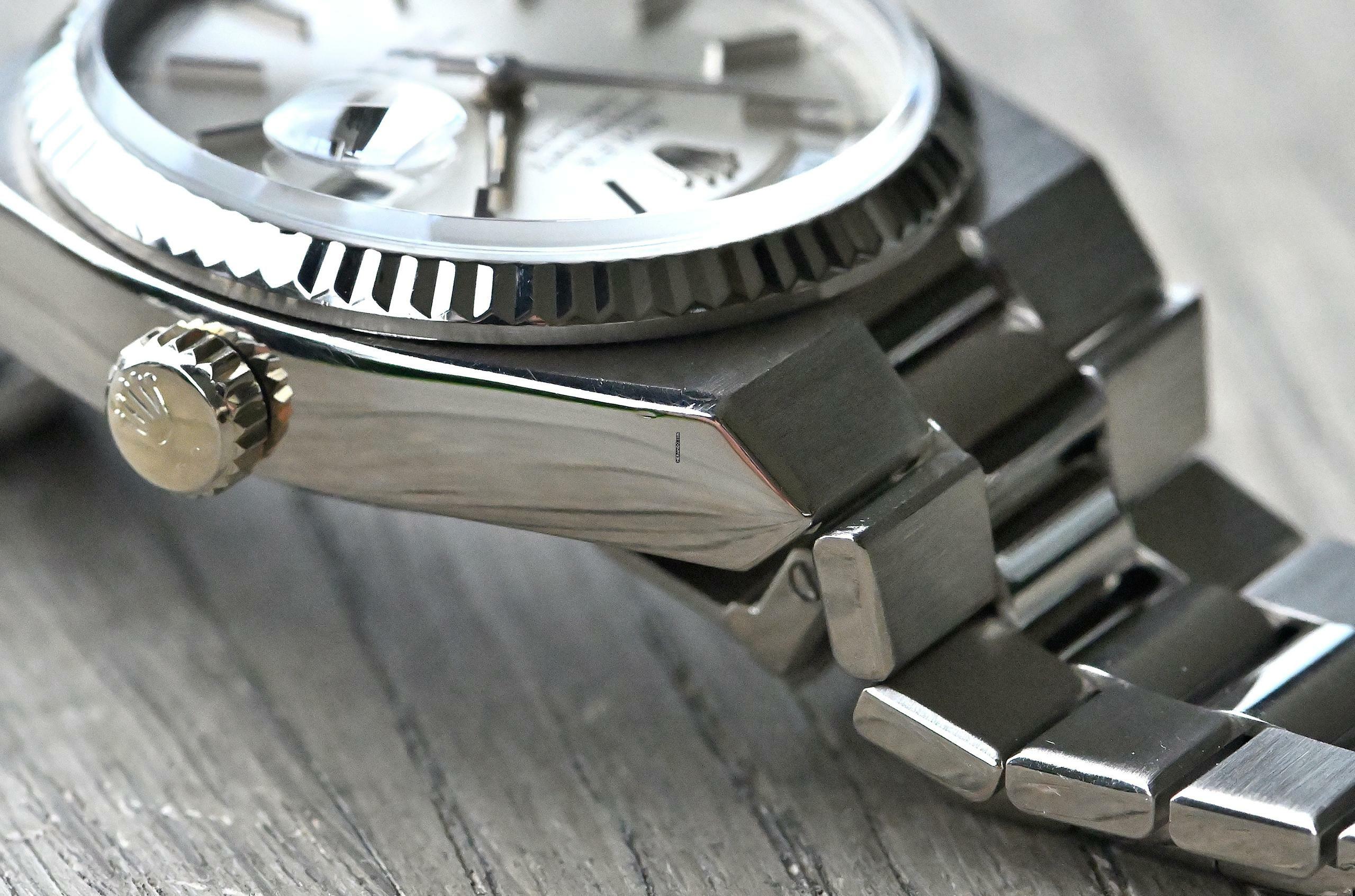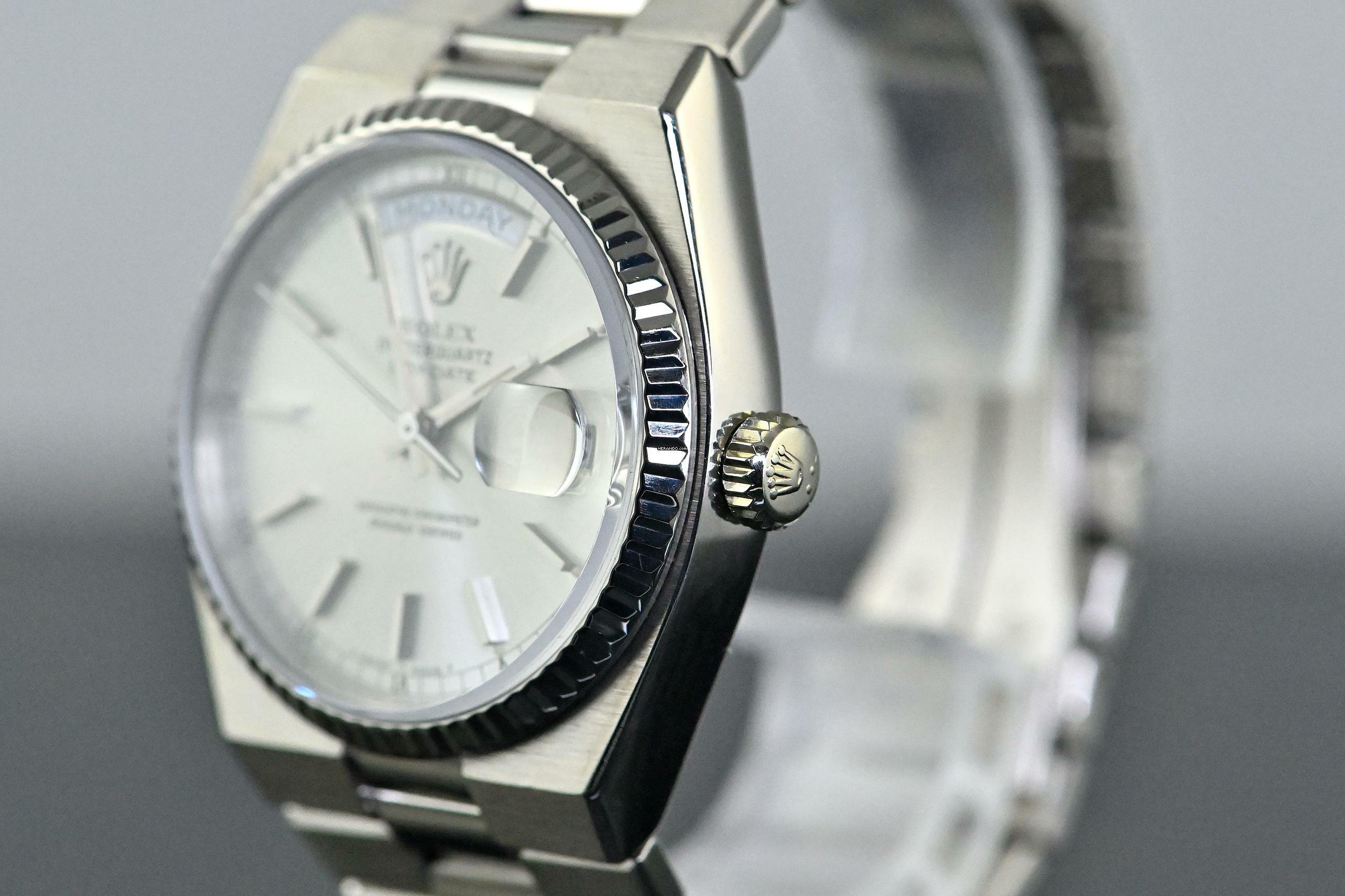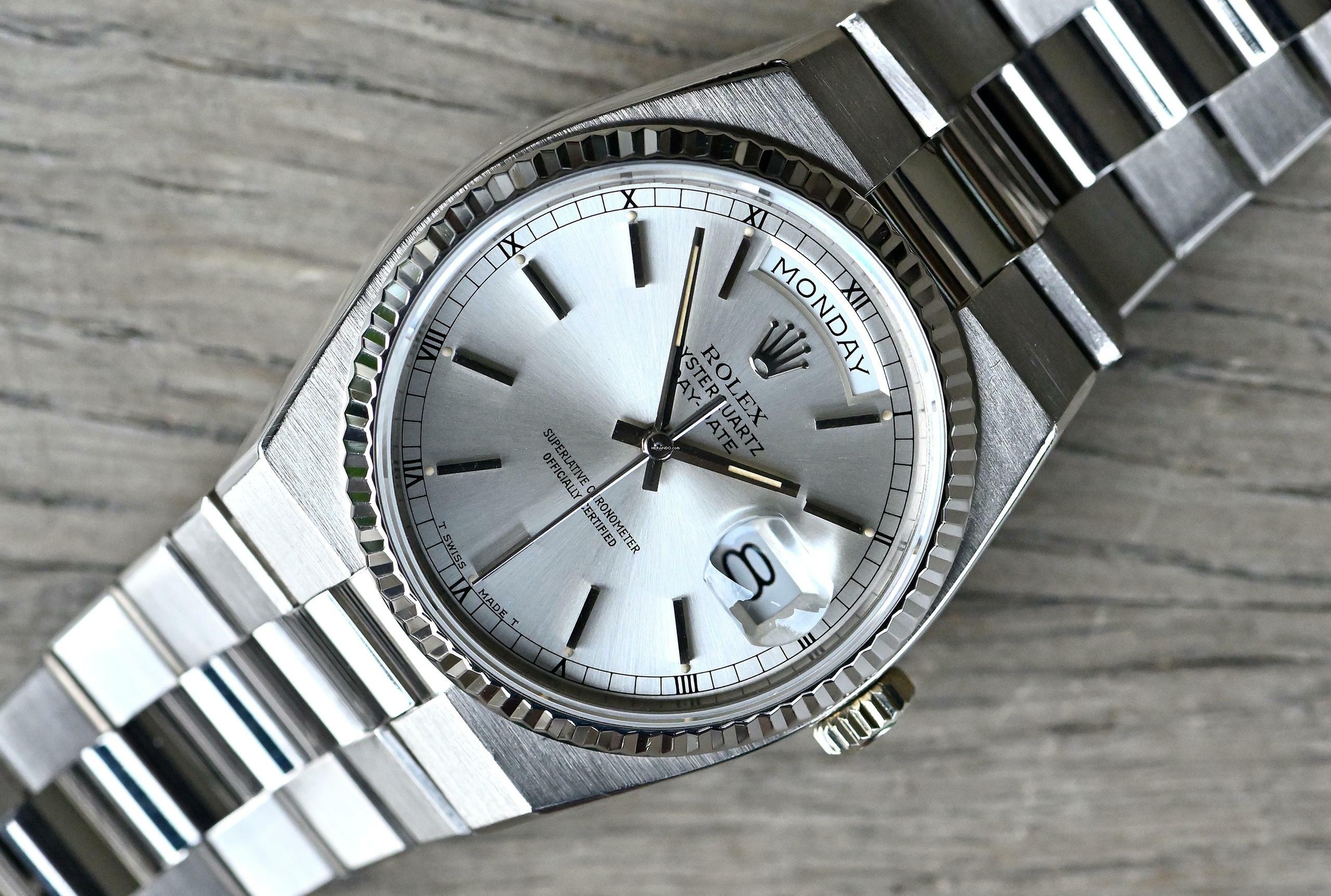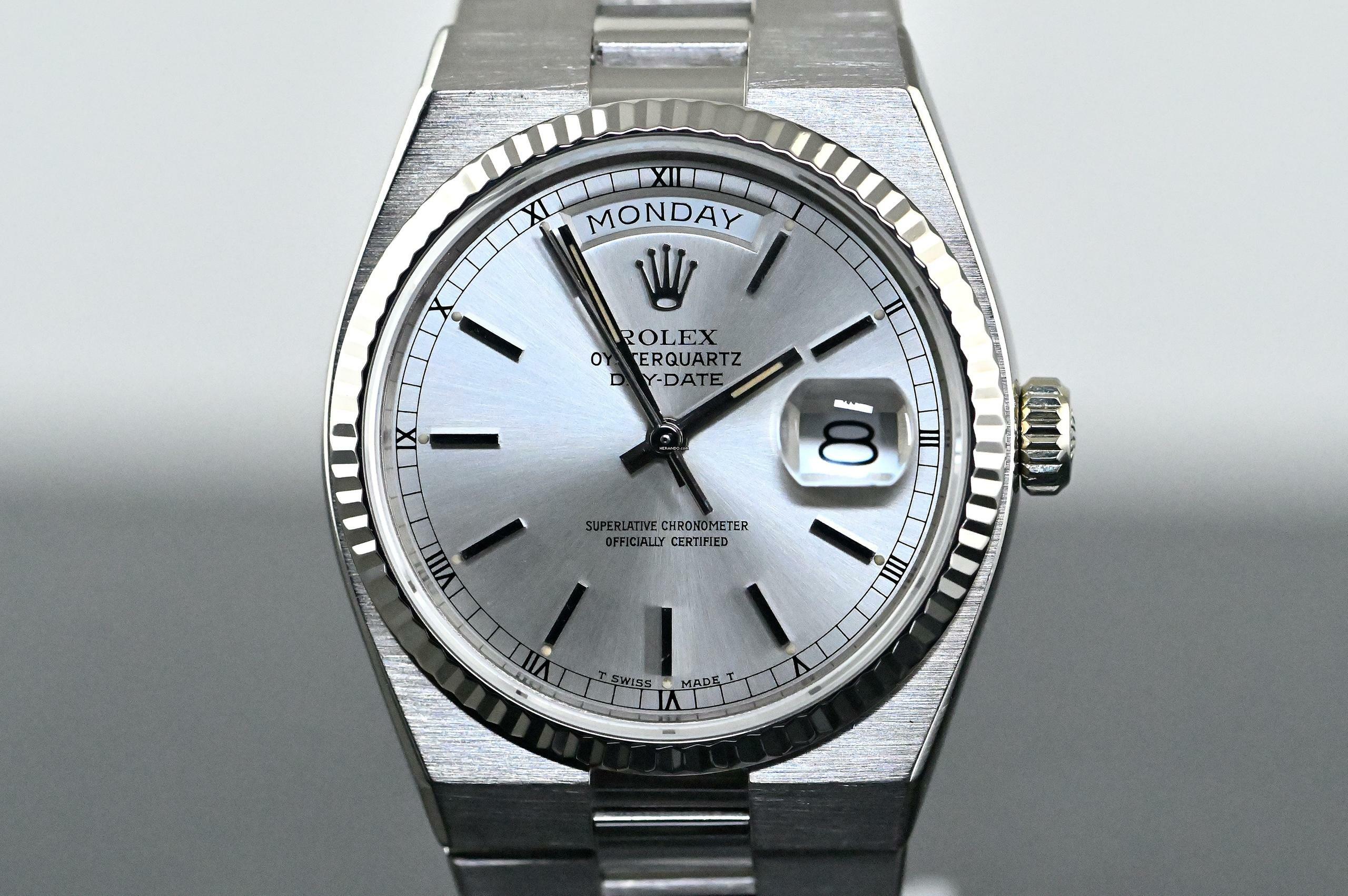 Very rare and special Vintage Rolex Day-Date Oysterquartz | reference 19019 | in 18k white gold | serial number 7,148,xxx | produced in 1981 | Rolex Quartz calibre 5055, which has had its battery recently replaced | undervalued for many years, but in recent years it has been receiving more and more of the attention it deserves | the new Rolex model: the Landweller, has also contributed to the popularity of the Vintage Oysterquartz models from the 1970s and 1980s | this version is the rare and sought after white gold model, which is a lot rarer than the yellow gold version | original silver dial with original hands | very good condition and together with the set, this package is an absolute dream for any collector | original white gold bracelet (with minimal stretch) with a folding clasp in 18k white gold | bracelet currently has an inner circumference of approx. 17.5 cm | another dismantled element enclosed which can be screwed into the bracelet if required | total weight approx. 155.3 grams | enclosed original Oysterquartz box with matching outer carton - original warranty certificate (sold in 1982 in Lugano, Switzerland) - Oysterquartz booklet - chronometer translation - pocket calendar from 1982 - chronometer hang tag - Wempe invoice from August 2025 for inspection of the movement and water resistance, as well as battery replacement. An Oysterquartz Day-Date in white gold in this set and condition is a special piece for any Rolex vintage enthusiast and is sure to make many hearts beat faster!