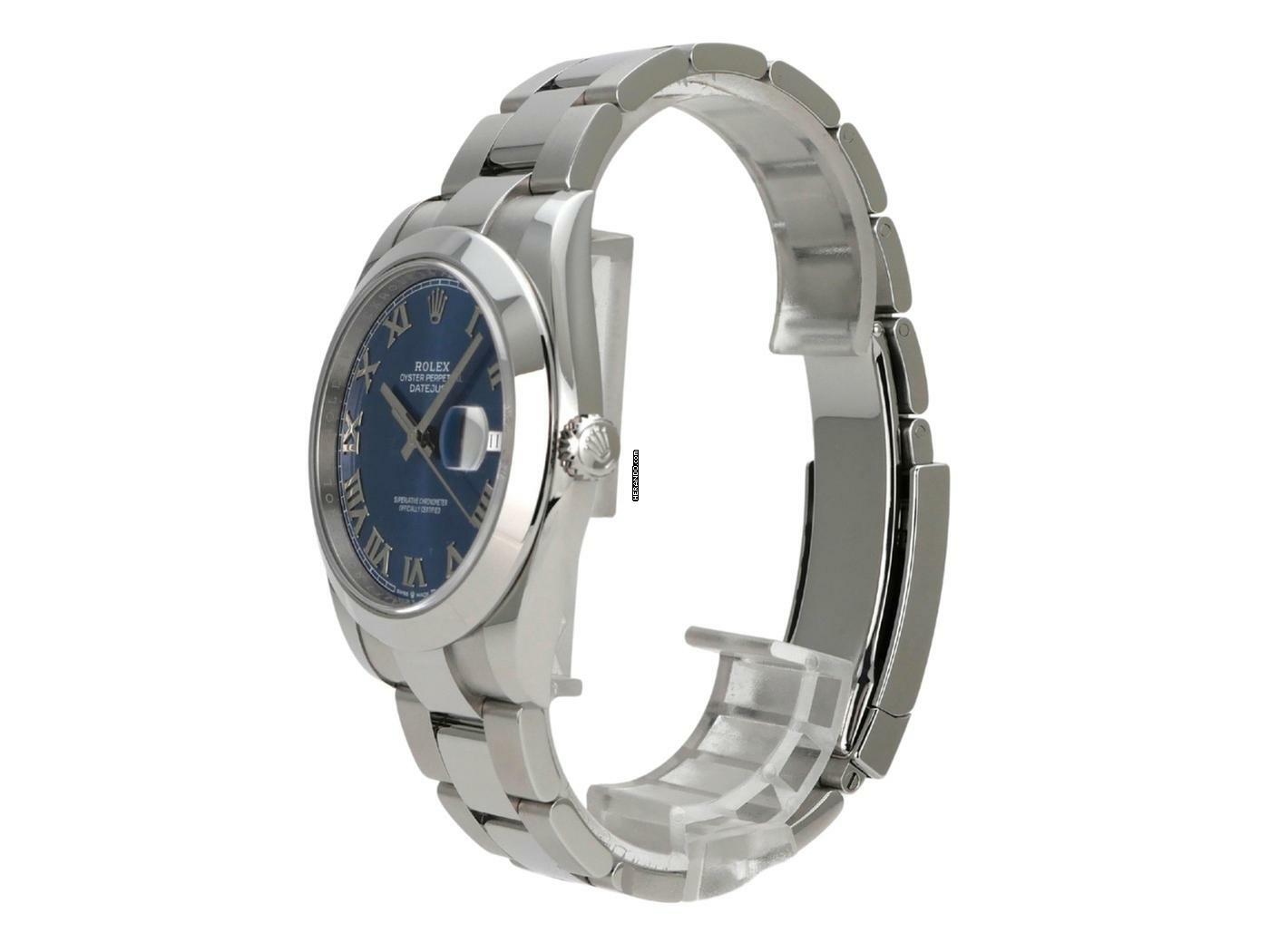 Gehäuse aus Edelstahl poliert und satiniert, Gehäusedurchmesser 41 mm, polierte Edelstahl Lünette, Oyster Edelstahlband poliert und satiniert mit Faltschließe, blaues Zifferblatt mit römischen Ziffern, Automatikwerk, Rolex Manufakturkaliber 3235, Chronometer, 70 Stunden Gangreserve, Datumsanzeige, kratzfestes Saphirglas, verschraubte Krone, Edelstahlboden verschraubt, wasserdicht bis zu 10 bar.