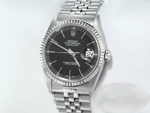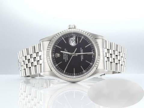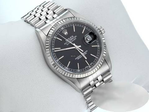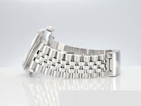 Diese wunderschöne Rolex ist aus Edelstahl gefertigt und mit einer Lünette aus feinstem Weissgold 750 veredelt wordenFantastisches schwarzes Zifferblatt mit großen silbernen Stabindices und kleinen römischen Zahlen