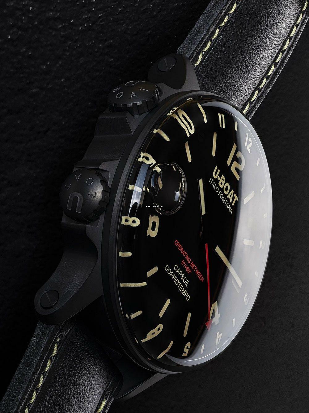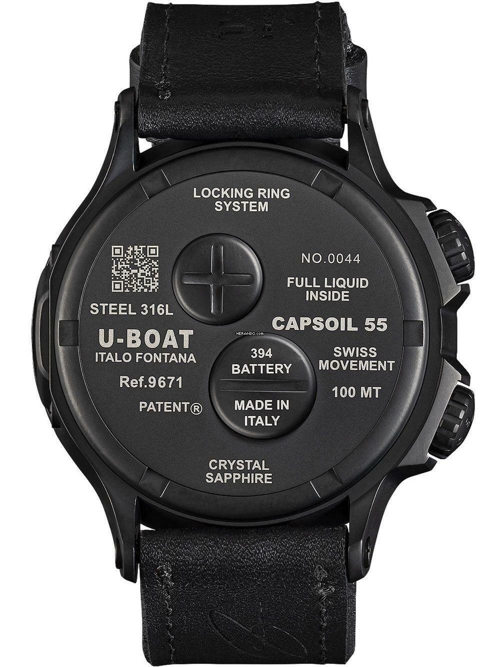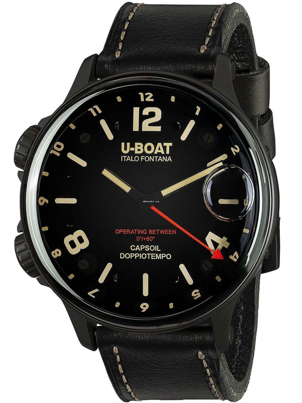 U-Boat 9671Die U-Boat Herrenuhr 9671 ist ein aus der Modell-Serie Capsoil Doppiotempo DLC GMT 55mm. Die GMT Funktion zur Anzeige einer zweiten Zeitzone ist anhand des pfeilförmigen und farblich hervorgehobenen zweiten Stundenzeigers komfortabel ablesbar. Heimatzeit und Ortszeit behalten Sie so immer im Blick. Eine perfekte Wahl, wenn Sie einen Zeitmesser mit einem Look suchen.