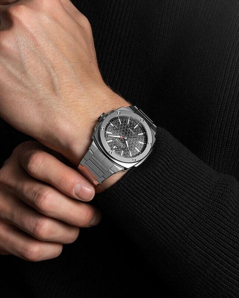 Das Runde Gehäuse ist 41 mm breit sowie 13 mm hoch und schmückt, natürlich abhängig vom individuellen Geschmack, nahezu jedes Handgelenk. Vom Gehäuse hebt sich die Feststehende Lünette dezent ab, ebenso die Verschraubte Krone. Beim Gehäuseboden der Uhr handelt es sich um einen Glasboden, verschraubt, der den Schlusspunkt für ein ansprechendes Design setzt.