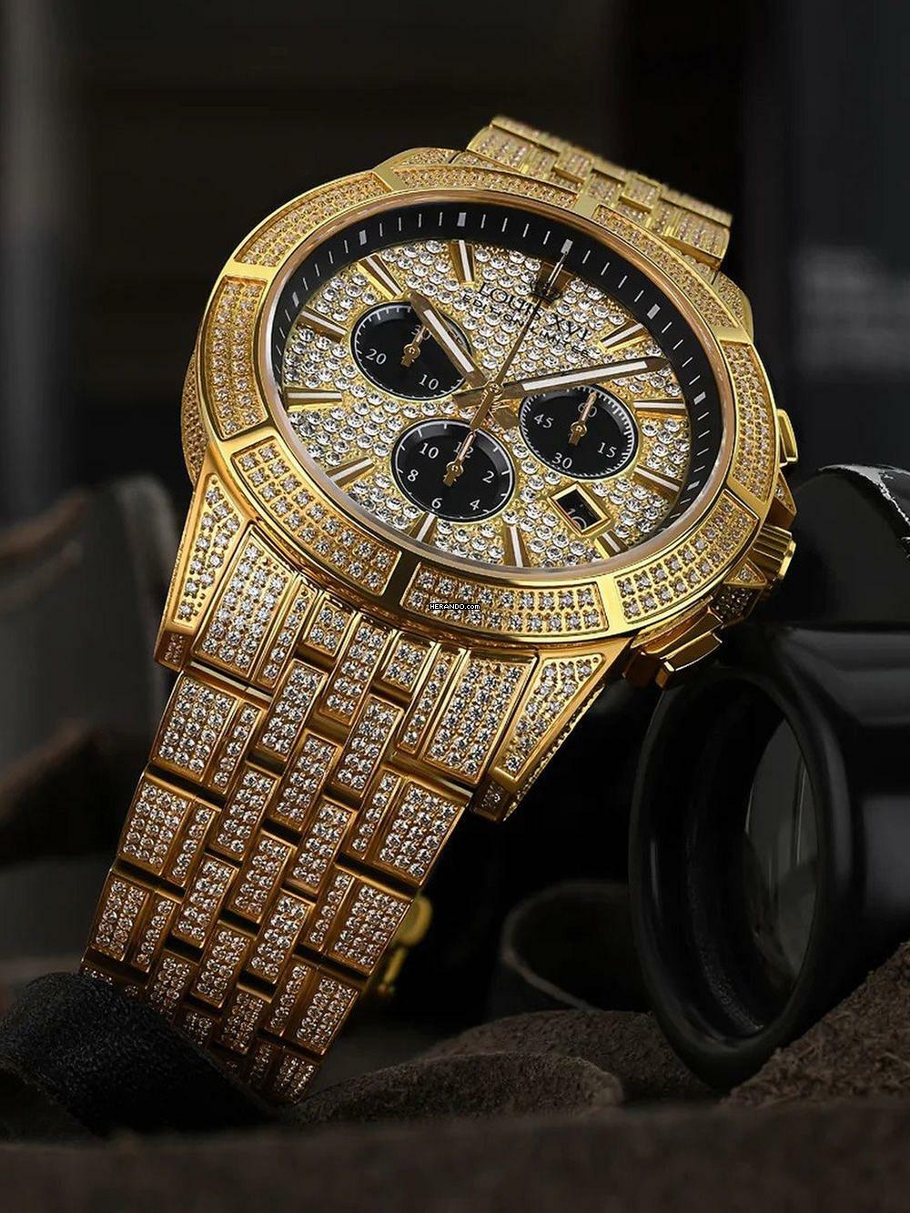Die Armbanduhr verfügt über ein goldenes Gehäuse, aus Edelstahl gefertigt, das durch die Mattiert, Polierte Oberfläche wie ein echter Eyecatcher wirkt.