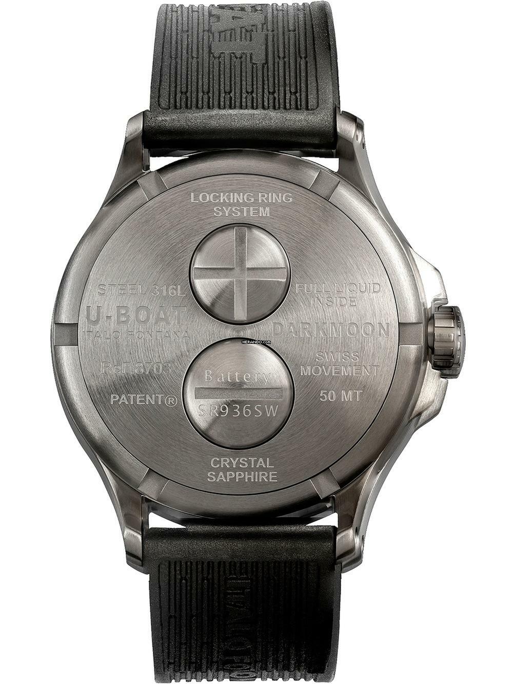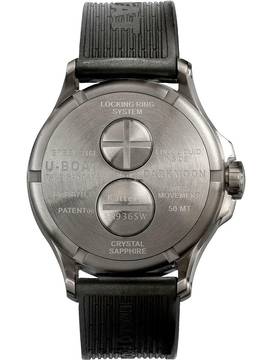 Edelstahl AISI 316L, komplett gefüllt mit einem speziellen Öl, welches das Zifferblatt umhüllt und die Illusion der Abwesenheit von Glas erzeugt, sowie einen optischen Effekt einer höheren Ablesbarkeit. Sichtbare Luftblase auf dem Zifferblatt, um die Temperaturschwankungen auszugleichen. Charakteristische Krone auf der linken Seite. Durchmesser 44 mm.