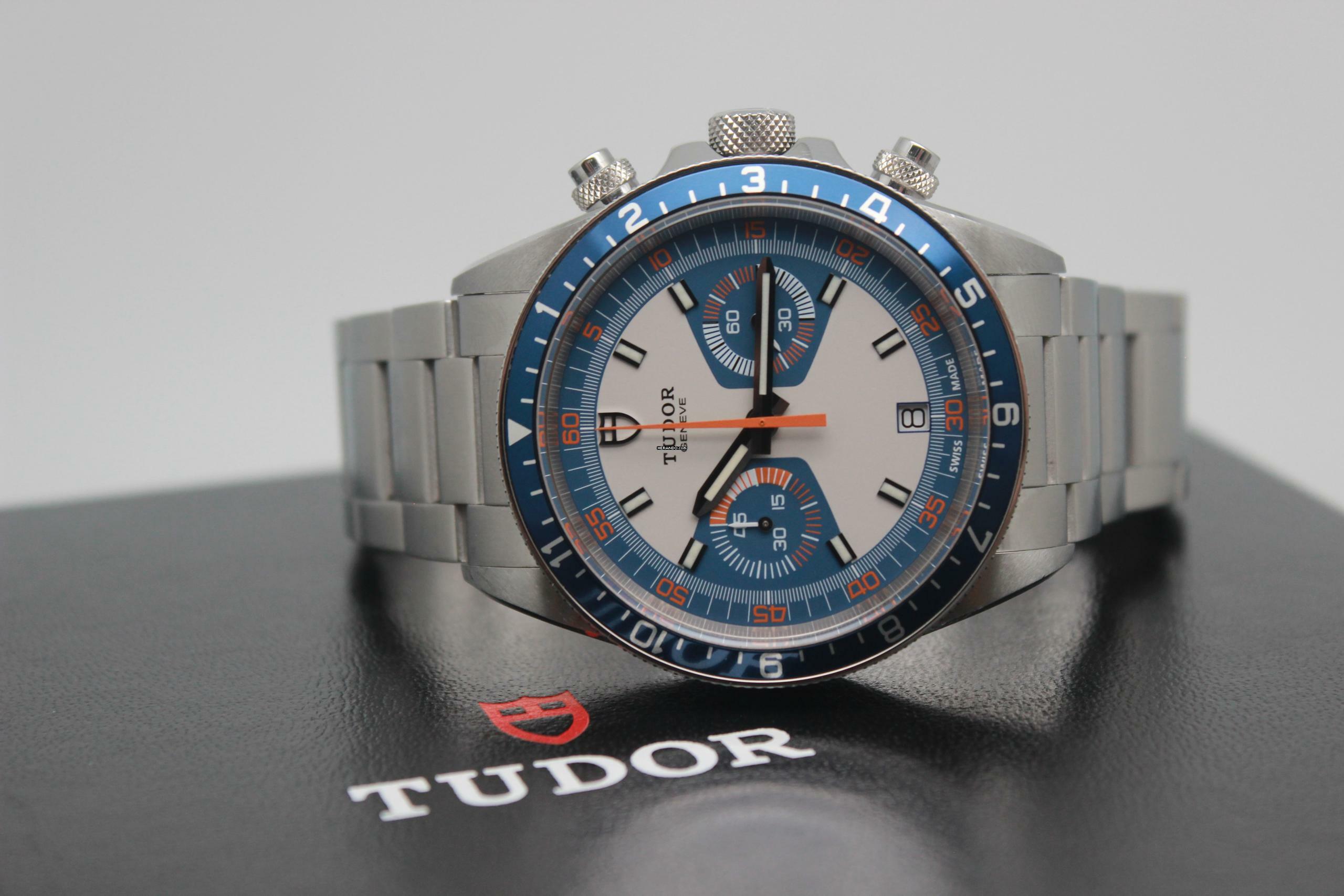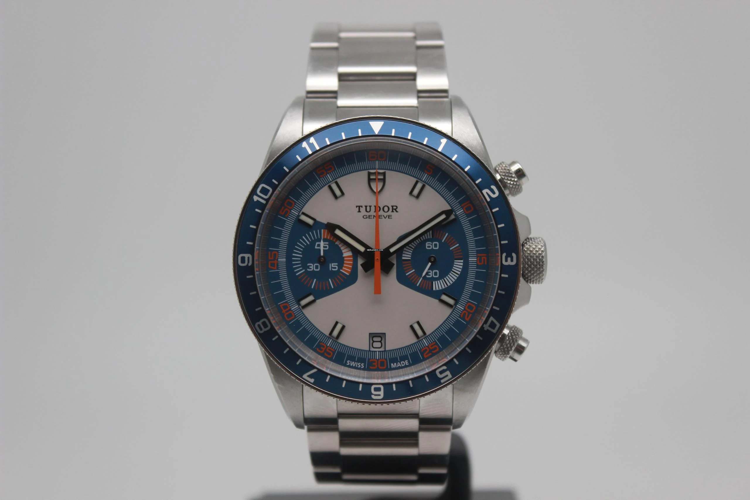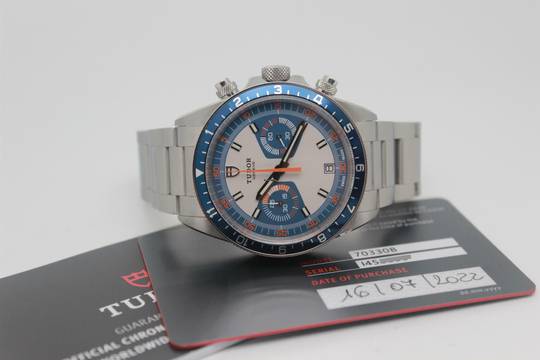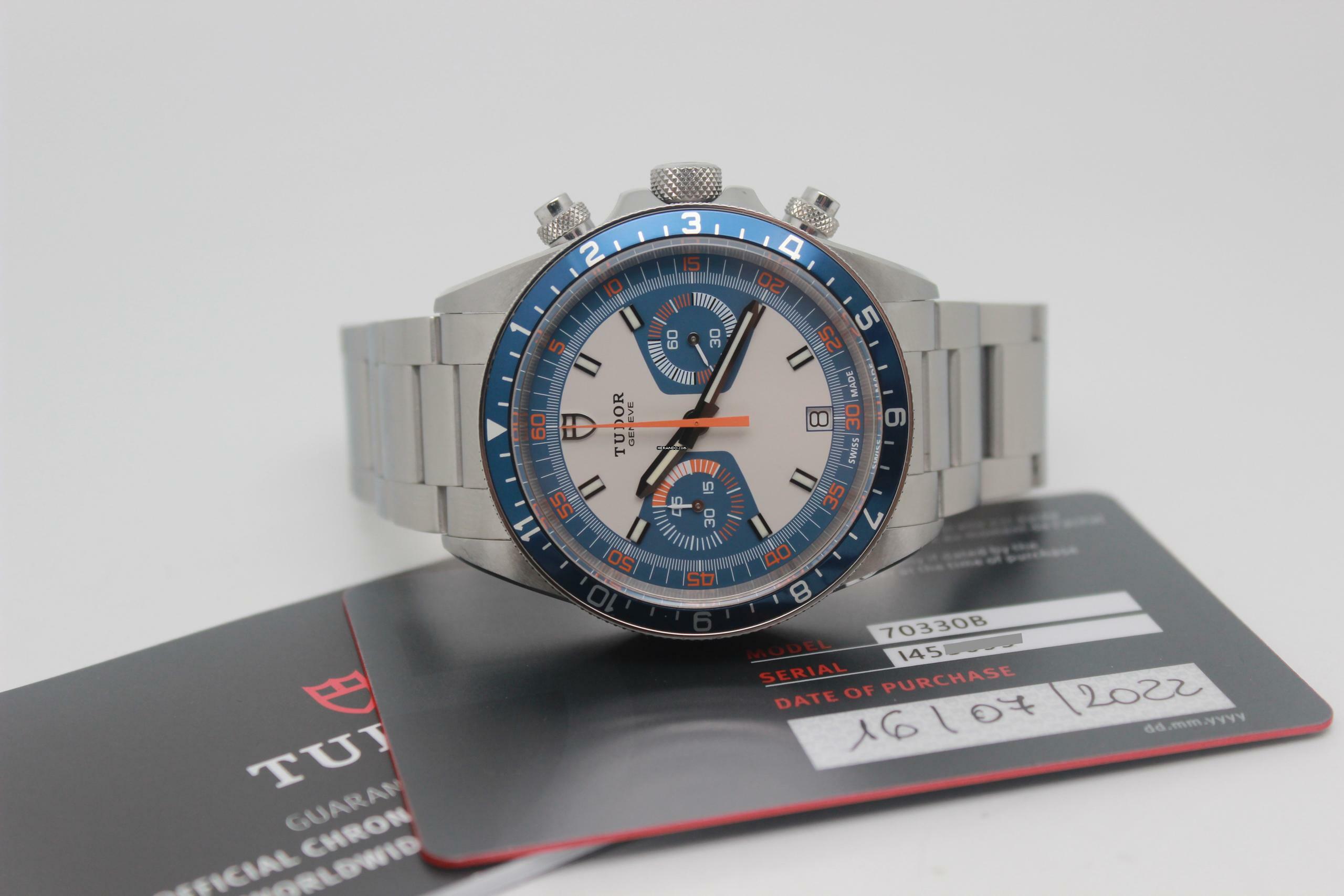Tudor Heritage Chrono Blue 70330B Full Set 2022, cassa in acciaio da 42 mm, quadrante blu, lunetta in acciaio con inserto in alluminio blu, bracciale in acciaio satinato con chiusura déployante in acciaio. Corredato di scatola e card di garanzia originali Tudor.