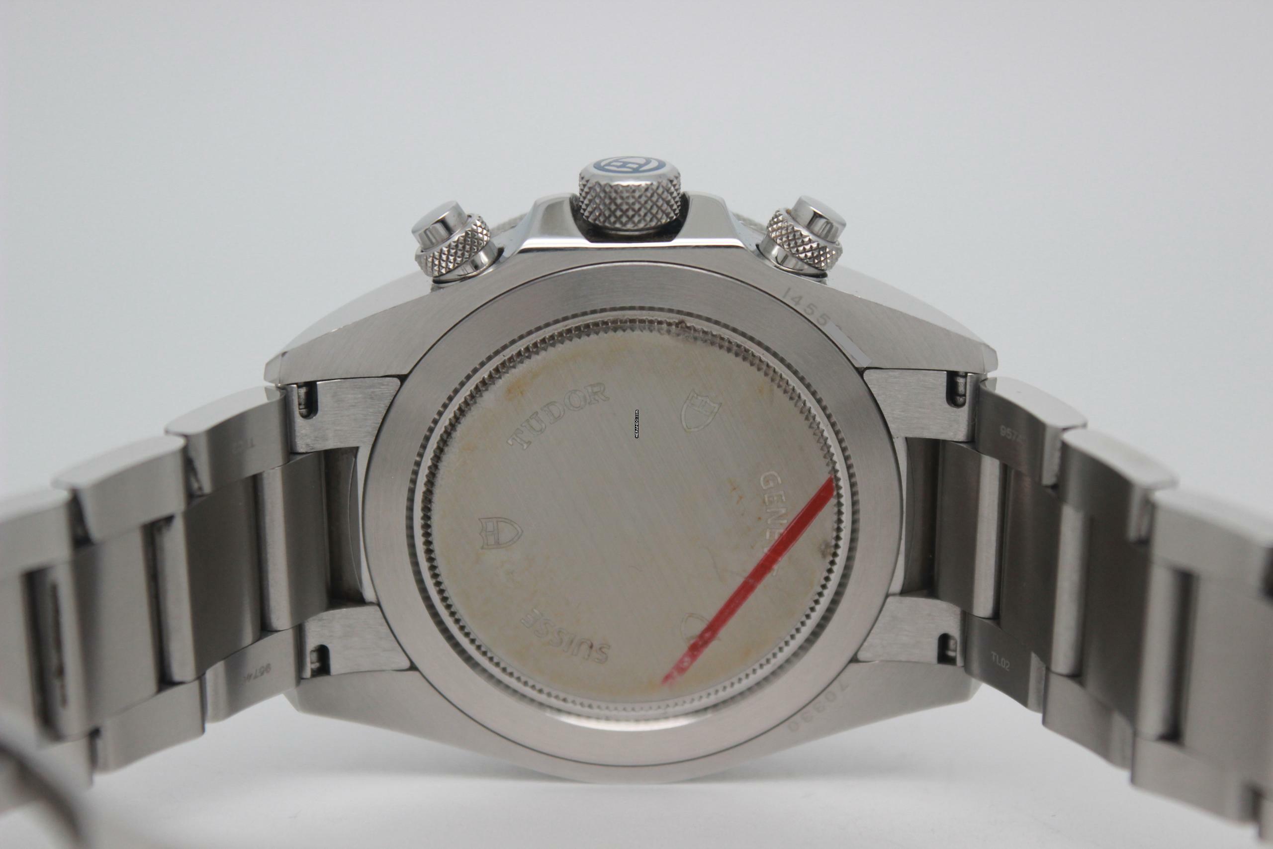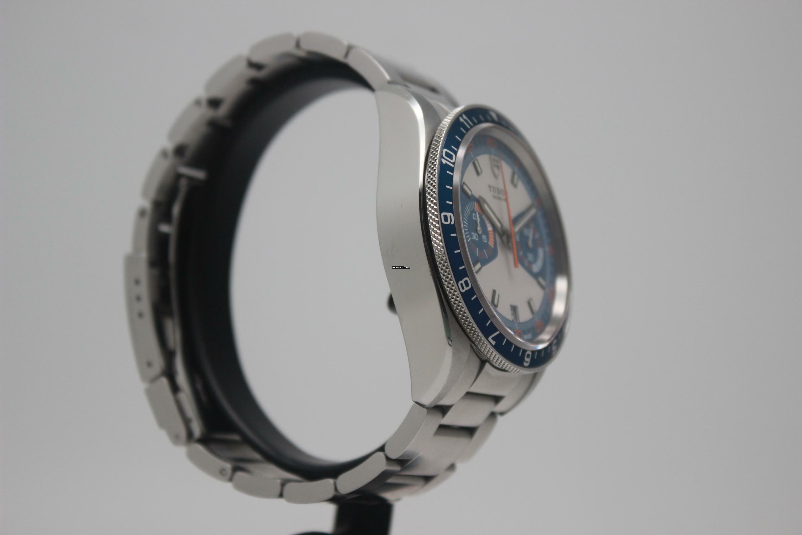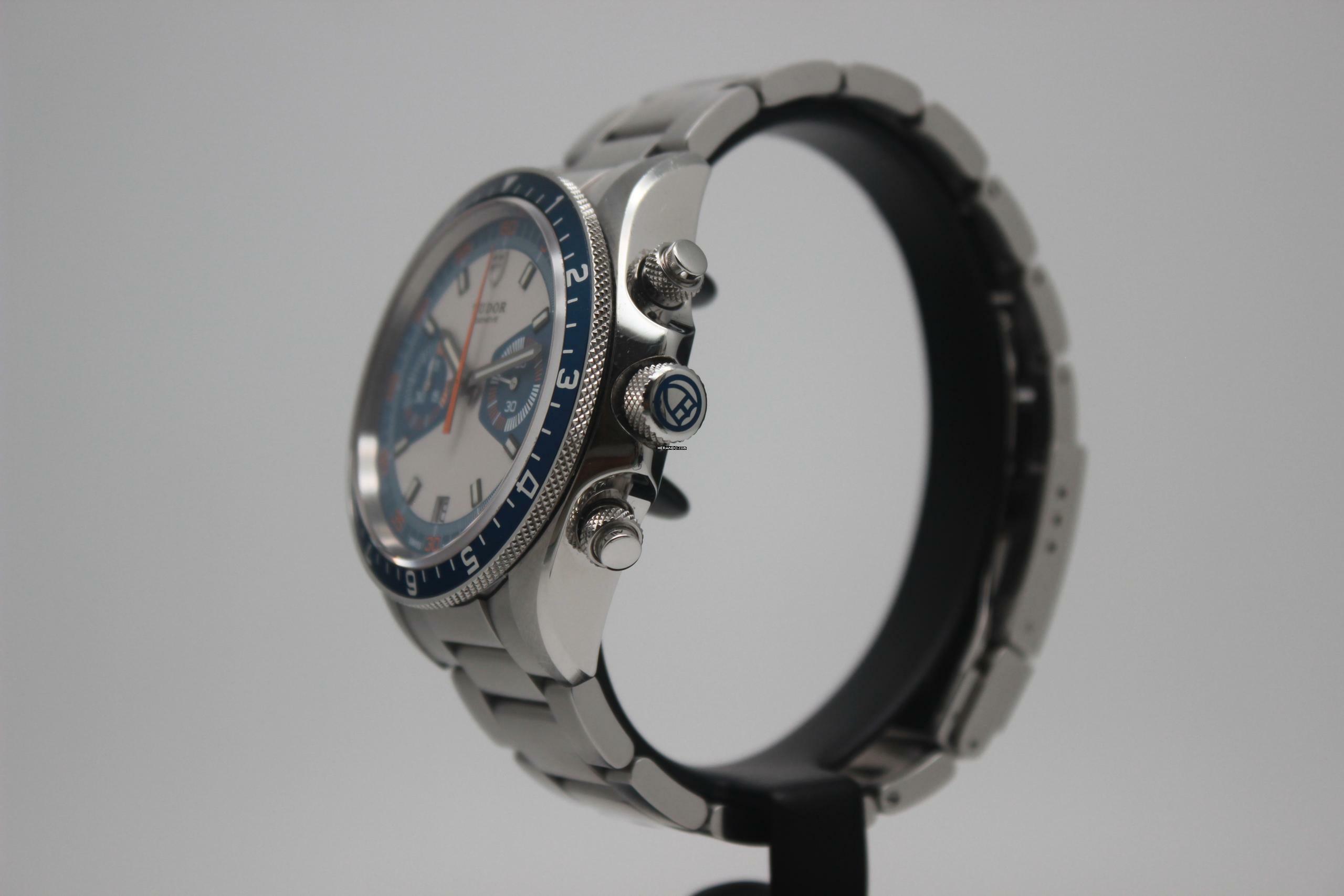 Tudor Heritage Chrono Blue 70330B Full Set 2022, cassa in acciaio da 42 mm, quadrante blu, lunetta in acciaio con inserto in alluminio blu, bracciale in acciaio satinato con chiusura déployante in acciaio. Corredato di scatola e card di garanzia originali Tudor.