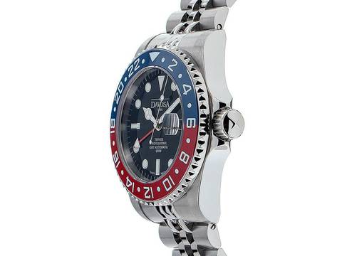 Davosa Ternos GMT Stahl Keramik Automatik Armband Stahl Gehäuse Edelstahl poliert und satiniert, Gehäusedurchmesser ohne Krone 42mm, Gehäusehöhe 14,0mm. Lünette Edelstahl mit rot / blauem Keramik Inlay, einseitig drehbar. Armband Edelstahl poliert und satiniert, Sicherheitsfaltschließe Edelstahl mit Hersteller-Logo. Zifferblatt schwarz mit aufgesetzten Edelstahl Leuchtindexen und Edelstahl Leuchtzeigern. Uhrwerk Automatik, Kaliber DAV 3032 mit 21 Edelsteinen, Gangreserve ca. 52 Stunden. Anzeige von Stunde, Minute und Sekunde über Zeiger aus der Mitte mit Sekundenstopp zur sekundengenauen Einstellung der Uhrzeit, Datumsanzeige mit Schnellverstellung unter Glaslupe bei 3 Uhr, zweite Zeitzone (GMT) ablesbar über Lünette, einstellbar über rotem Zeiger aus der Mitte. Saphirglas kratzfest. Krone verschraubbar mit Flankenschutz und Hersteller-Logo. Boden Edelstahl verschraubt und graviert. Gewicht der Uhr inklusive Armband 186g, Länge des Armbandes inklusive Gehäuse 200mm. Wasserdicht bis 20 ATM. Referenznummer: 161.590.06, ID: P151212000925H-1590, Artikelnummer: 10000082281. Original Davosa Box und Garantie Papiere von Juni 2021 sowie Beschreibung, Full Set. Neu. Lieferzeit sofort. Inklusive Uhrenpass mit einem Farbbild, der genauen Beschreibung sowie dem Wiederbeschaffungswert der Uhr über 1590,-€ und 1000 Tage Garantie ab Kaufdatum.