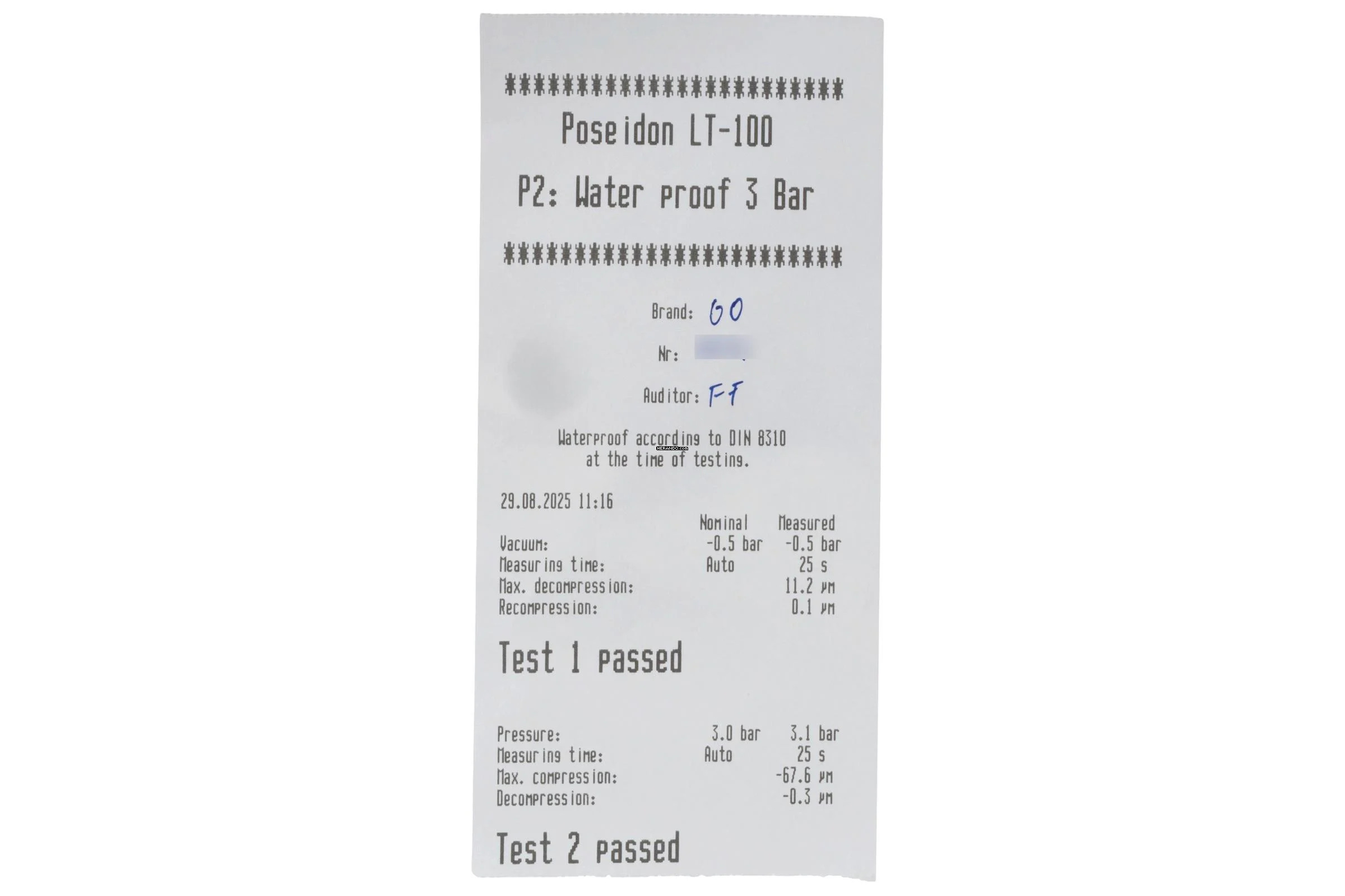- Wasserdichtigkeit*: ja. Das Prüfprotokoll mit Prüfdruckangabe liegt bei.
