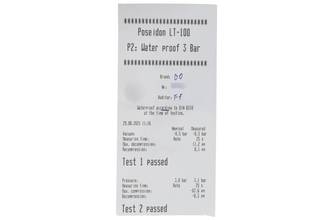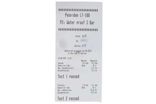 * Wenn die Uhr positiv auf Wasserdichtigkeit getestet wurde, dann gilt diese Eigenschaft zum Zeitpunkt der Messung. Wasserdichtigkeit ist nach DIN 8310 keine bleibende Eigenschaft. Sie sollte jährlich und vor besonderen Belastungen überprüft werden, da die eingebauten Dichtelemente in ihrer Funktion und im täglichen Gebrauch nachlassen. Einflüsse wie starke Temperaturschwankungen, Chlor, Seife oder Salzwasser wirken sich negativ auf die Wasserdichtigkeit aus.