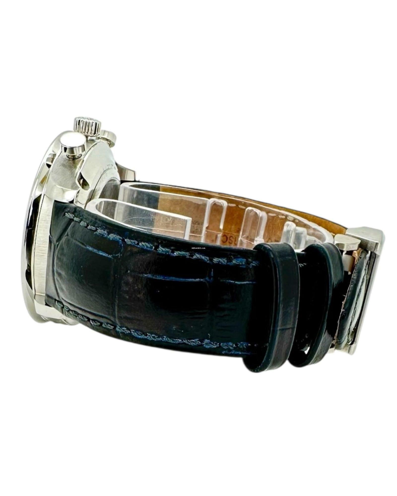 Suchen Sie nach einem zeitlosen Zeitmesser mit klassischem Flair? Entdecken Sie die IWC Portugieser Chronograph Bucherer Referenz IW371447 mit schwarzen Zifferblatt und silbernen Ziffern, sowie Zeigern. Diese Uhr verkörpert Eleganz und Präzision und ist ein Meisterwerk der Uhrmacherkunst. Das schwarze Zifferblatt verleiht ihr eine raffinierte Ästhetik, die jeden Betrachter fasziniert. Die IWC Portugieser IW371447 zeichnet sich durch ihr ikonisches Design und ihre hochwertige Verarbeitung aus. Mit ihrem Edelstahlgehäuse und Lederarmband in Alligatoroptik ist sie ein Symbol für Stil und Qualität. Diese Uhr ist nicht nur ein Blickfang am Handgelenk, sondern auch ein zuverlässiger Begleiter im Alltag. Ihr automatisches Uhrwerk sorgt für eine präzise Zeitmessung, während das kratzfeste Saphirglas die Uhr vor äußeren Einflüssen schützt. Erleben Sie die zeitlose Schönheit und die erstklassige Handwerkskunst der IWC Portugieser IW371447 mit schwarzen Zifferblatt – ein Must-have für Uhrenliebhaber und Kenner.